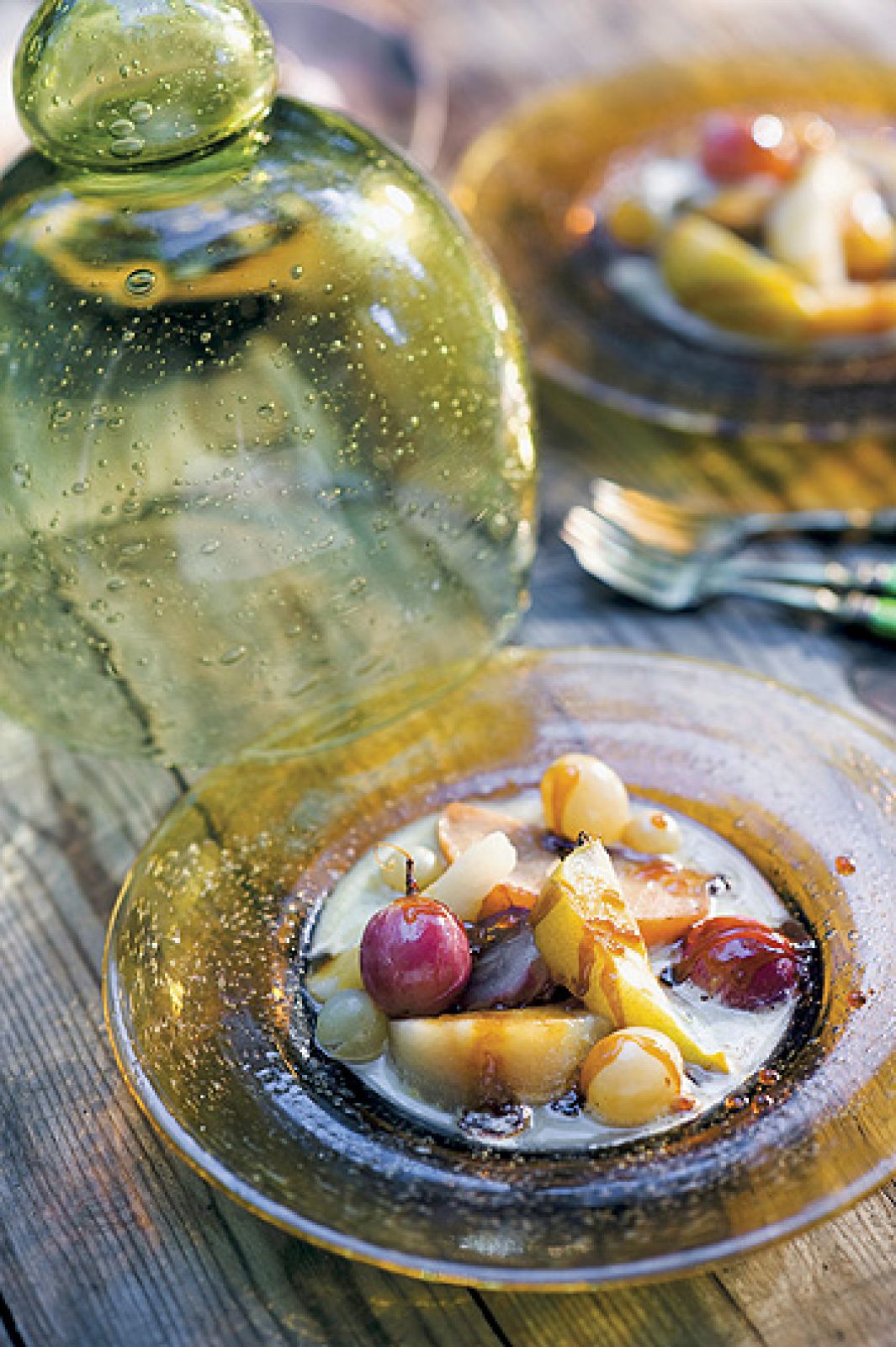 Jabłka i gruszki obierz, usuń gniazda nasienne, pokrój w ćwiartki. Winogrona przekrój na pół, ze śliwek usuń pestki. Rozgrzej masło na patelni i wrzuć owoce. Smaż 5 minut, wsyp cukier i smaż jeszcze 2 minuty. Do dużej miski dodaj żółtka z cukrem, wlej wino i ubijaj nad garnkiem z gotującą się wodą. Gdy masa zgęstnieje, natychmiast ją schłodź. Wymieszaj ze śmietanką. Owoce nałóż do miseczek, polej zabajone.