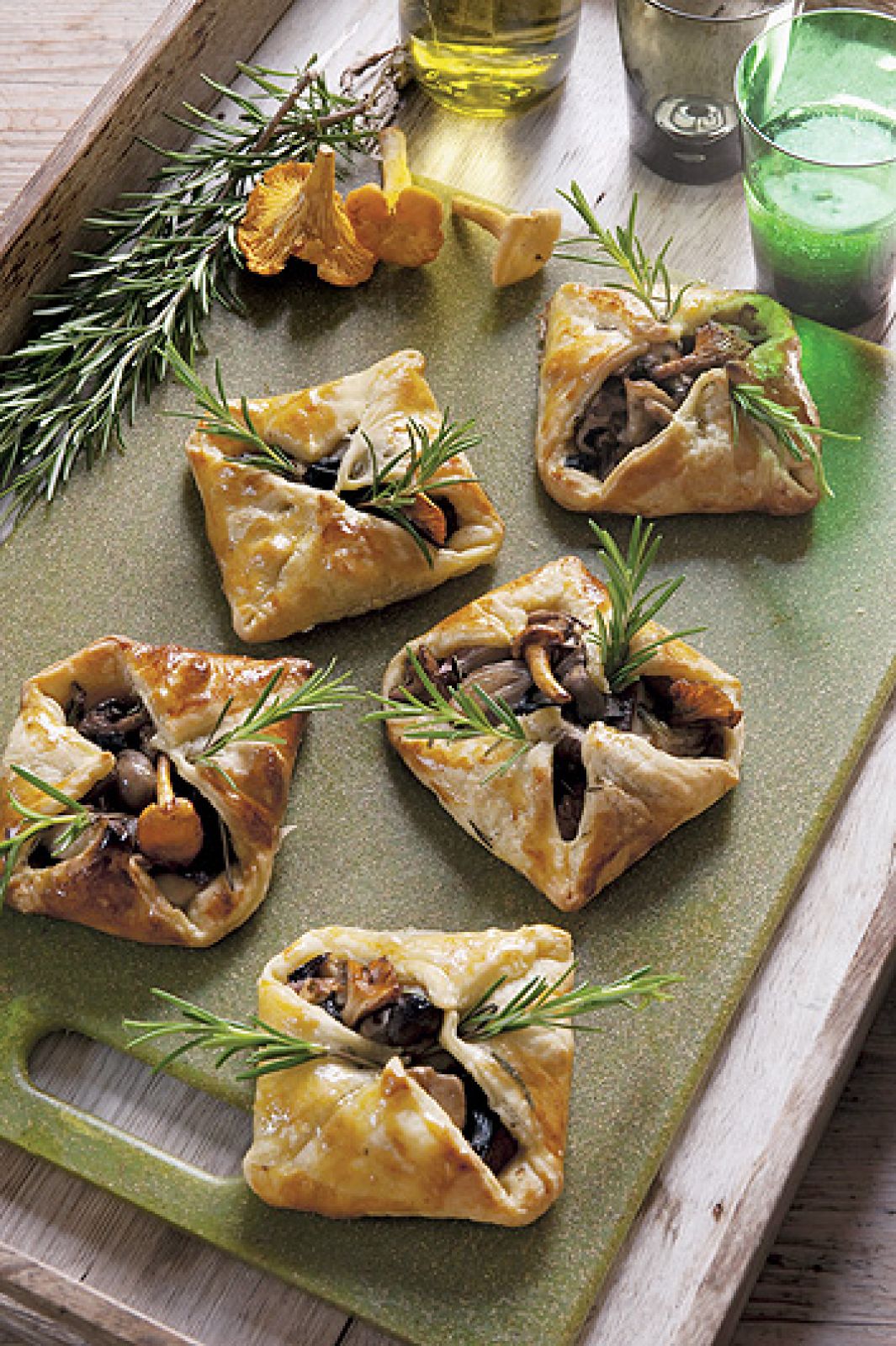 Ciasto rozłóż i pokrój na kwadraty. Szalotki posiekaj, szynkę pokrój w paseczki. Rozgrzej oliwę i masło na patelni, wrzuć szalotkę i smaż, mieszając 2 minuty. Dodaj szynkę, smaż chwilę, wrzuć oczyszczone grzyby oraz pół gałązki rozmarynu. Dopraw i smaż 7 minut. Pozostały rozmaryn pokrój na gałązki długości 3-4 cm. Na każdy kawałek ciasta nałóż po 2-3 łyżki farszu, złóż rogi do środka i przekłuj delikatnie gałązką rozmarynu. Posmaruj żółtkiem, wstaw do piekarnika rozgrzanego do 200ºC na 10 minut. Zmniejsz temperaturę i piecz jeszcze 10 minut.