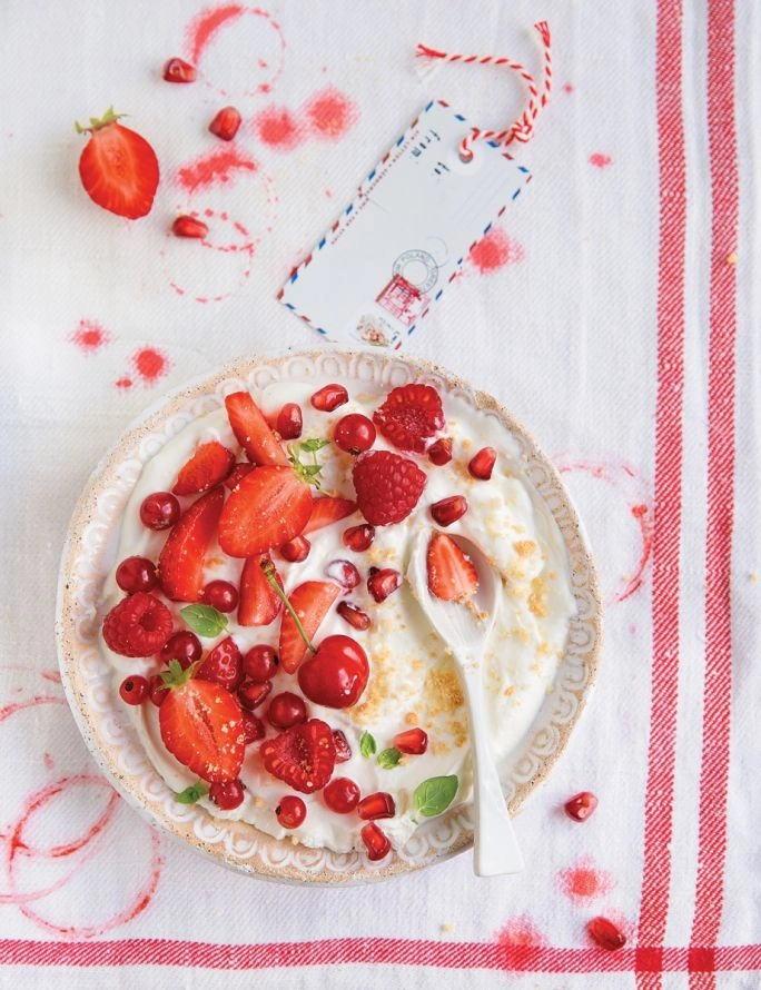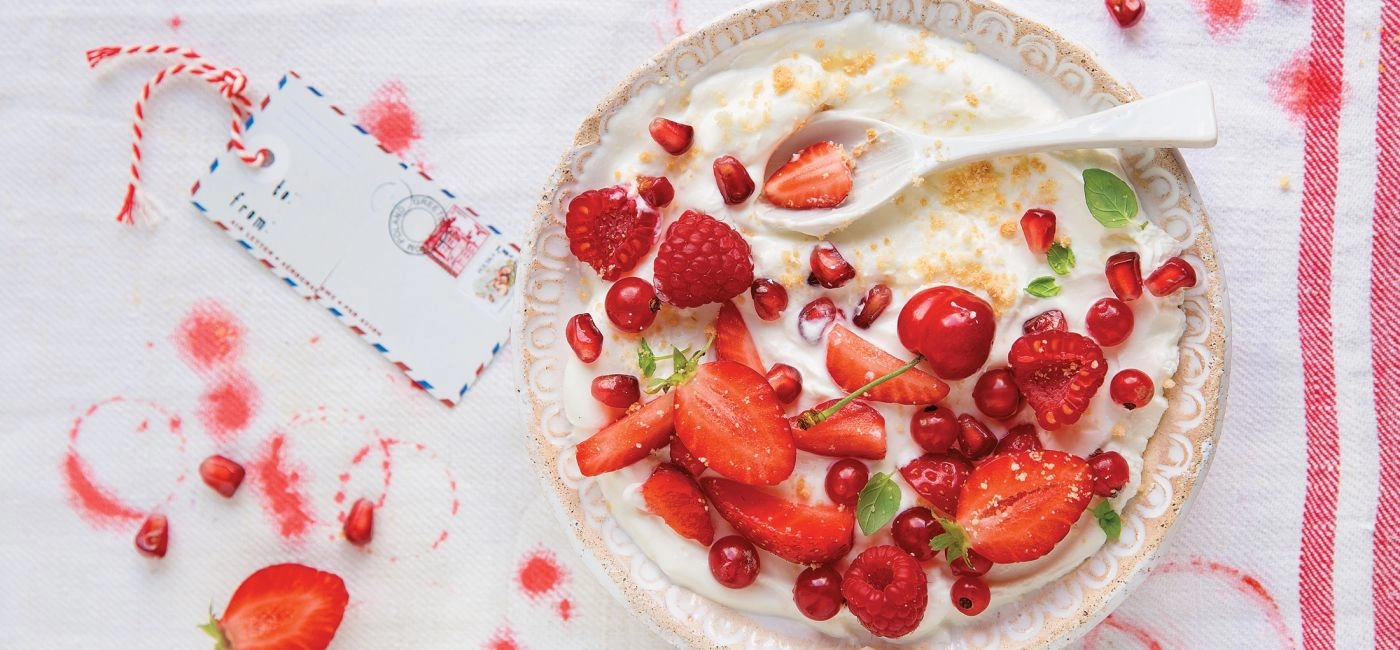 3. Słodki labneh z czerwonymi owocami: truskawkami, malinami, czereśniami albo porzeczkami