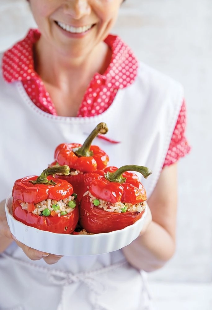 Weź: •½ szklanki ryżu jaśminowego •łyżeczkę masła •½ łyżeczki soli •szklankę gorącej wody •łyżkę oleju •dużą cebulę •½ małej czerwonej papryki •½ szklanki mrożonego zielonego groszku •5-6 suszonych pomidorów w oleju •słodką i ostrą paprykę •2 łyżki tartego parmezanu •3-4 papryki czerwone •sól •pieprz •2-3 łyżki oliwy