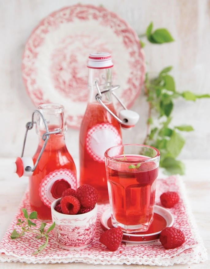 Weź: •3-4 łodygi rabarbaru •3-4 łyżki cukru •garść liści świeżej mięty •½ kg malin •1½-2 l wody