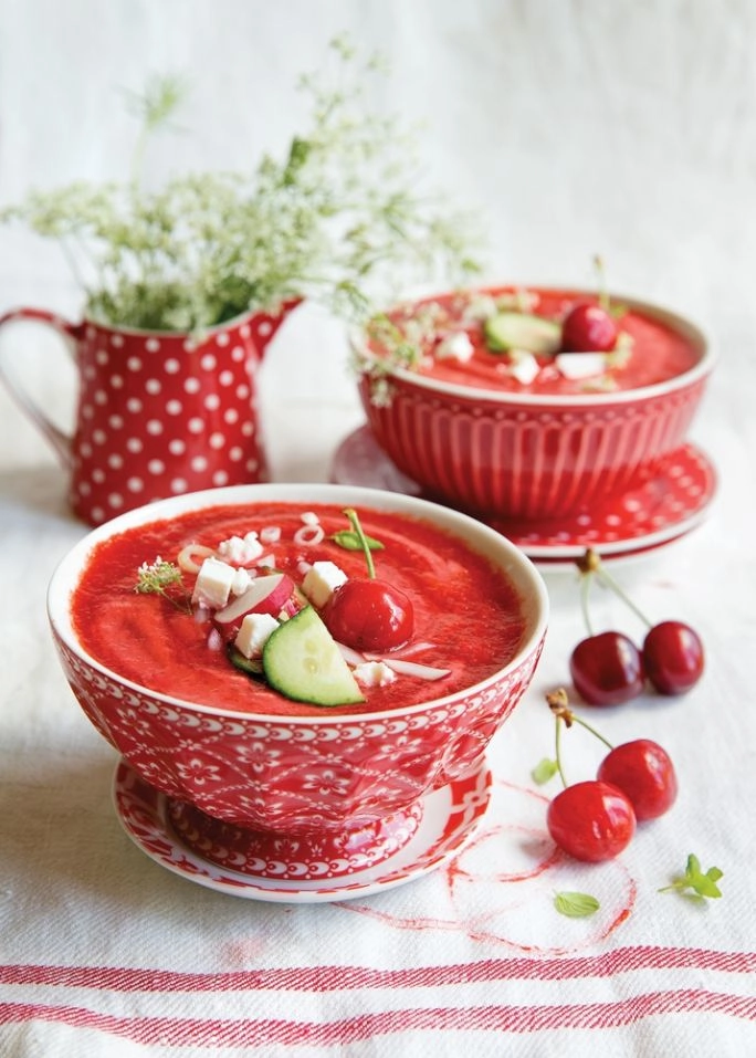 Upieczone pomidory i wypestkowane czereśnie zmiksuj w blenderze wraz z oliwą, sokiem z cytryny, chili, cebulą i rozgniecionymi ząbkami czosnku oraz kostkami lodu na gładkie purée. Można przetrzeć przez sito, jeśli ktoś nie lubi resztek skórek pływających w talerzu. Ogórek, paprykę i pieczywo pokrój w drobną kostkę, wymieszaj z purée. Jeśli potrzeba, dodaj trochę wody. Dopraw solą, pieprzem i oregano, ewentualnie odrobiną cukru lub sokiem z cytryny, w zależności od tego, jak słodkie były pomidory. Schłodź przez 45 minut w lodówce i podawaj.