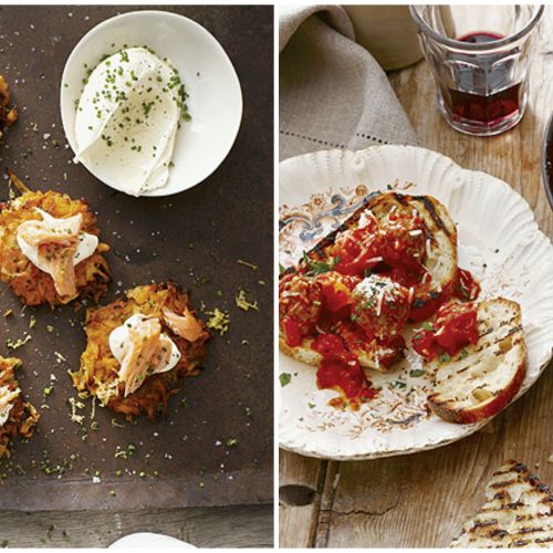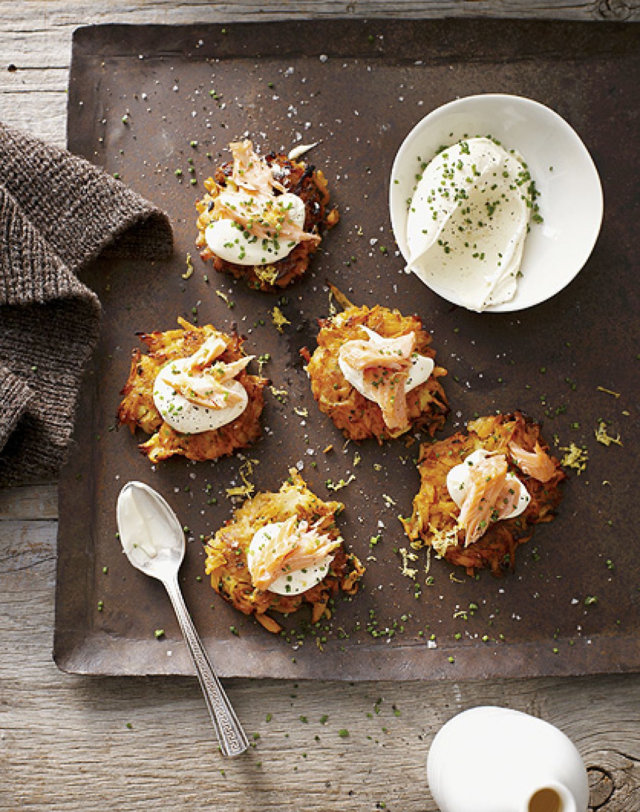Ziemniaki i cebulę obierz, zetrzyj na tarce o grubych oczkach. Odstaw na pół godziny, odciśnij dokładnie, dopraw solą i pieprzem. Dodaj jaja, mąkę i wymieszaj. Rozgrzej trochę oleju na patelni, formuj płaskie placuszki i smaż po 3 minuty z każdej strony, aż będą zrumienione. Osącz na papierowym ręczniku, podawaj na gorąco ze śmietaną, wędzonym łososiem, siekanym szczypiorkiem i ćwiartkami cytryny.