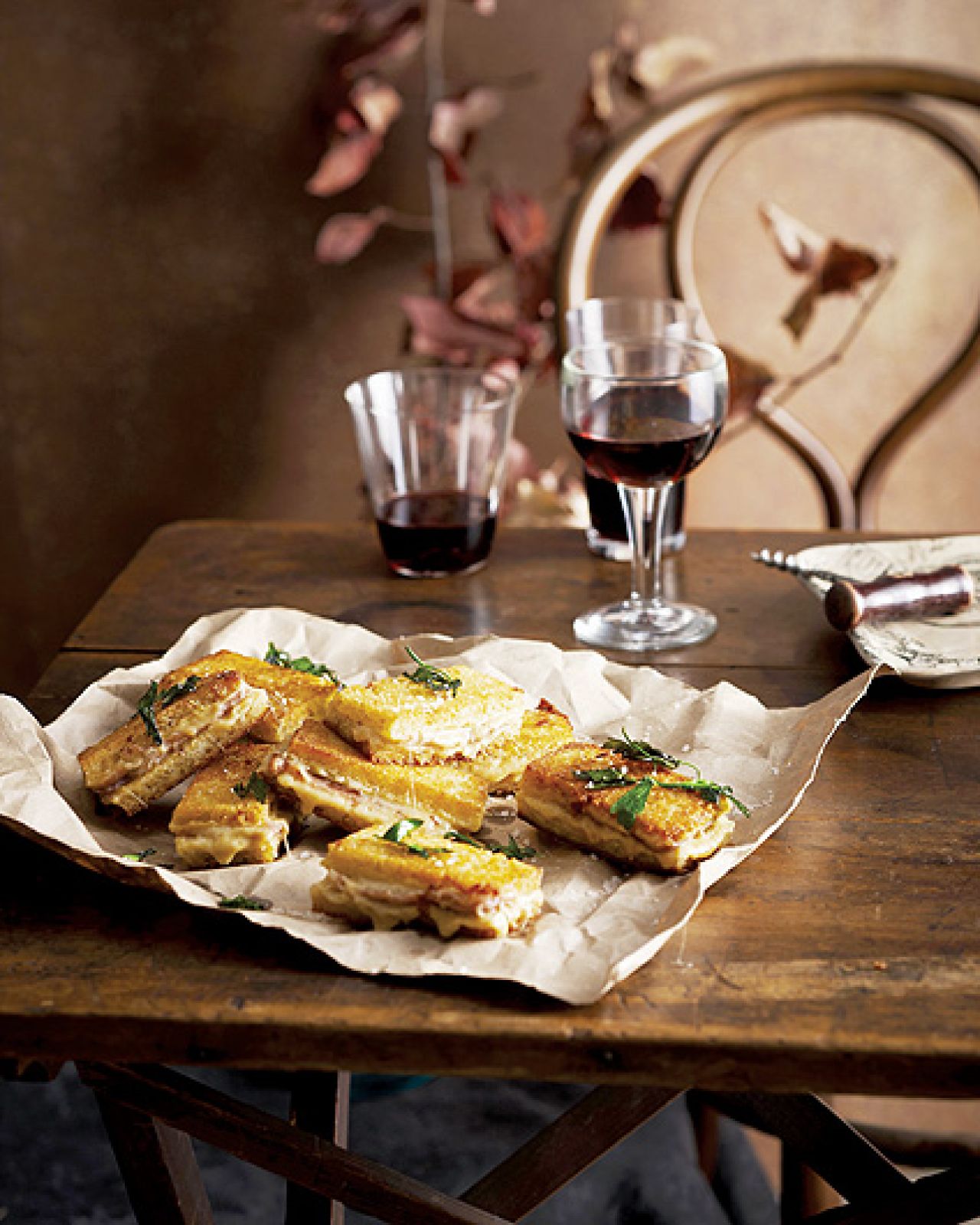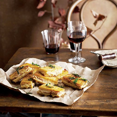 Ta popularna francuska potrawa nazywana jest croque monsieur (czyt. krok mesje). Najpierw włącz grill w piekarniku. Odetnij z pieczywa skórki, masło rozpuść w garnuszku. Posmaruj każdą kromkę z jednej strony masłem, włóż pod grill i zapiecz na złoto. Odstaw. Resztę masła zagrzej, dodaj mąkę i zrób zasmażkę. Wlewaj powoli mleko, mieszając, aż powstanie jednolita masa, dopraw solą, pieprzem i gałką. Zdejmij z ognia, wsyp 3 łyżki sera. Niezgrillowaną stronę każdego kawałka chleba posmaruj musztardą, połóż szynkę i posyp startym serem. Włóż pod grill na 2 minuty. Posmaruj wierzch serową pastą i zapiecz jeszcze 4 minuty. Przykryj drugą pajdą chleba i dociśnij.