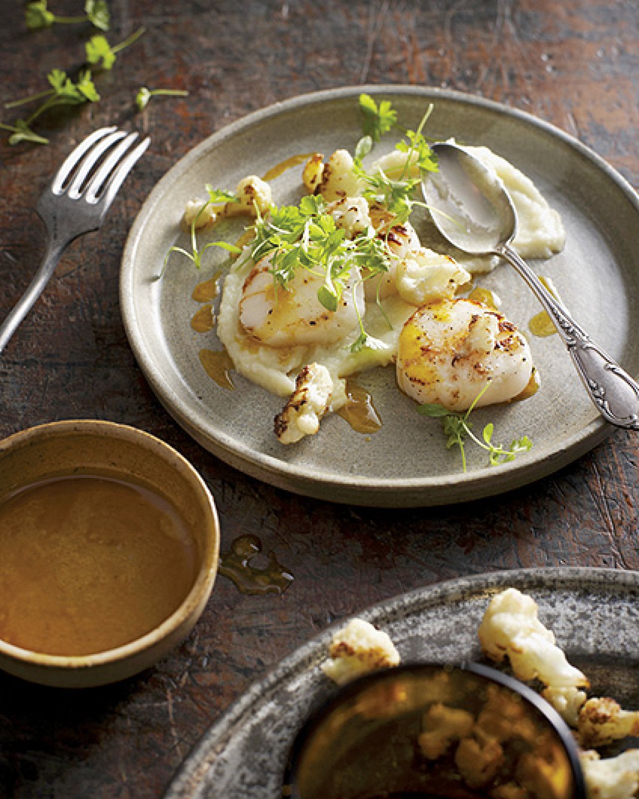 Przygotuj grecki sos skordalia: obierz ziemniaki i ugotuj, zrób purée z mlekiem i wyciśniętym czosnkiem. Przegrzebki przesmaż na klarowanym maśle po 2 minuty z każdej strony. Dopraw solą i pieprzem. Na talerze rozłóż po 3 łyżki skordalii, na to po 2 przegrzebki. Skrop tłuszczem ze smażenia małży i sokiem z cytryny, posyp posiekaną kolendrą.