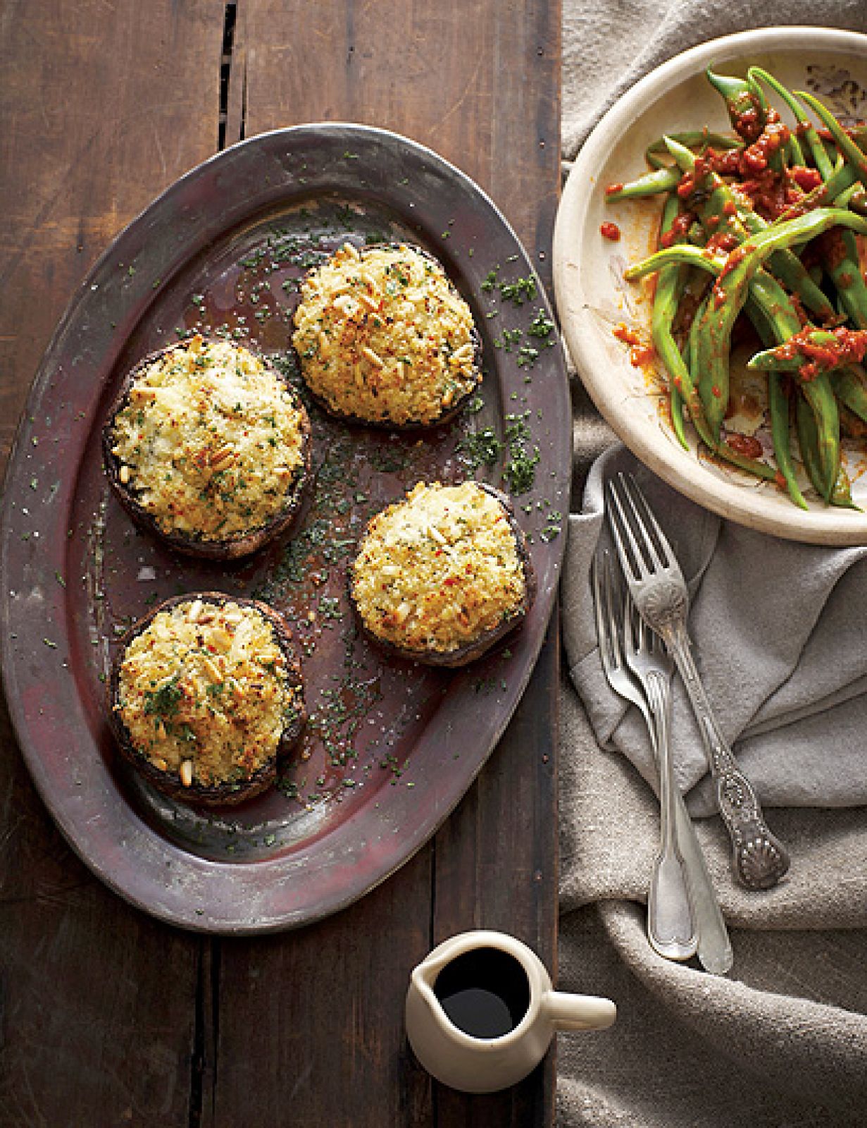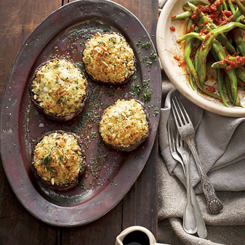 Pieczarki oczyść, odetnij nóżki. Posiekaj cebulę, wymieszaj z drobno pokrojonymi nóżkami pieczarek, dopraw solą i pieprzem, dodaj połowę natki. Wbij jajo, wsyp bułkę tartą, orzeszki pinii i wymieszaj. Nałóż farsz na kapelusze grzybów. Rozgrzej piekarnik do 180ºC, wstaw pieczarki na 25 minut. Ugotuj fasolkę i odcedź. Szalotkę i czosnek posiekaj, zeszklij na oliwie. Pomidory sparz, obierz, usuń nasiona, a miąższ drobno pokrój, dodaj do czosnku i cebuli. Posól i popieprz, duś przez 10 minut. Z gotowym sosem wymieszaj fasolkę i posyp natką.