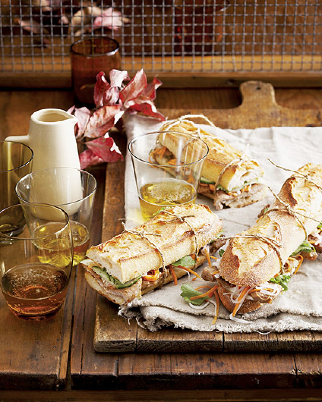 Wymieszaj sos sojowy z olejem i sokiem z limonki. Marynuj mięso przez godzinę, a następnie usmaż lub upiecz na grillu. Marchewkę pokrój w zapałki, blanszuj 2 minuty. Zalej wrzątkiem makaron, przykryj i odstaw na 3 minuty, odcedź. Ogórek pokrój w plasterki. Przekrój bagietki na pół, posmaruj sosem słodko-kwaśnym. Włóż plaster mięsa, marchew, makaron i ogórek. Posyp posiekaną natką, przykryj drugą połową bagietki i dekoracyjnie przewiąż sznurkiem kuchennym.