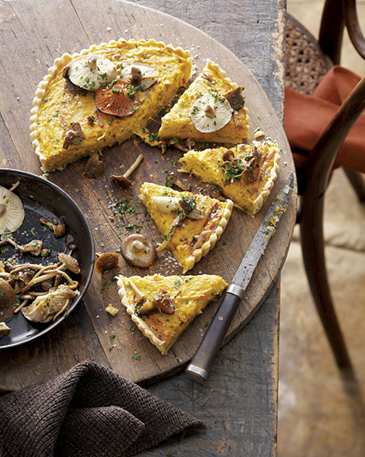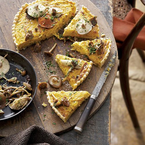 Usuń pestki i skórkę z dyni, pokrój ją w kostkę. Grzyby i por pokrój w plasterki. Rozgrzej na patelni oliwę i wrzuć dynię, dopraw solą, pieprzem, papryką i gałką muszkatołową. Duś 5 minut, dodaj por i grzyby. Zamieszaj, smaż 10 minut. Wyłóż okrągłą formę ciastem francuskim, nakłuj w kilku miejscach widelcem i wstaw na 5 minut do rozgrzanego do 180ºC piekarnika. Wyciśnij do nadzienia czosnek, dodaj ser, śmietanę i jaja. Wymieszaj i wylej na podpieczony spód. Piecz 25 minut. Udekoruj plasterkami grzybów i posiekaną natką pietruszki.