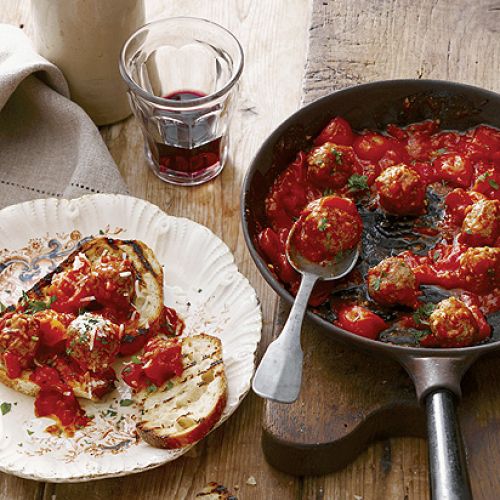 Wymieszaj mięso z natką, jajem i przyprawami. Uformuj nieduże pulpety i obrumień na oliwie. Szalotki i czosnek posiekaj. Pomidory wylej z puszki i rozgnieć widelcem na miazgę. Wymieszaj z cebulą i czosnkiem, wlej na patelnię, wrzuć pulpety. Dopraw, przykryj i duś kwadrans. W piekarniku lub na grillowej patelni upiecz kilka kromek wiejskiego chleba. Podawaj razem na ciepło.