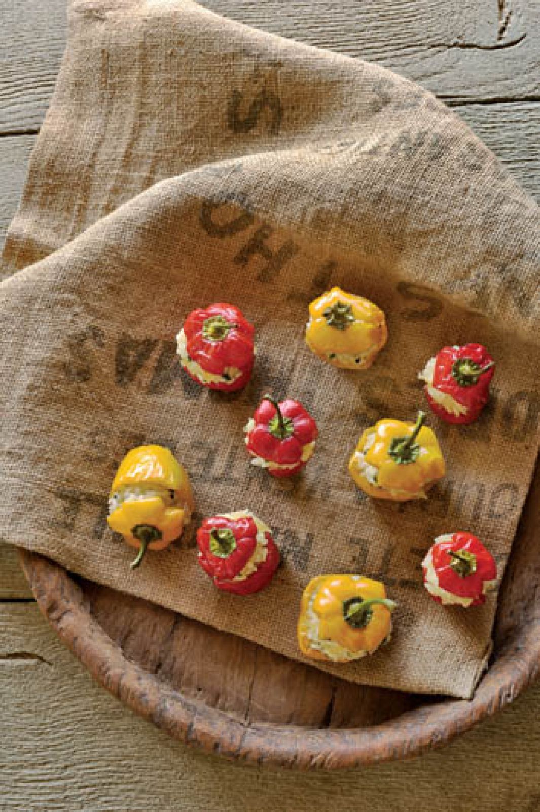 Pomidory umyj, odetnij czubki od strony szypułki, łyżką wybierz miąższ. Pistacje grubo posiekaj, orzechy ugnieć w moździerzu na proszek. Dodaj do twarożku razem z kurkumą, posiekaną dymką, papryką i oliwą. Dobrze wymieszaj, dopraw. Nałóż farsz do pomidorów i przykryj je czapeczkami.