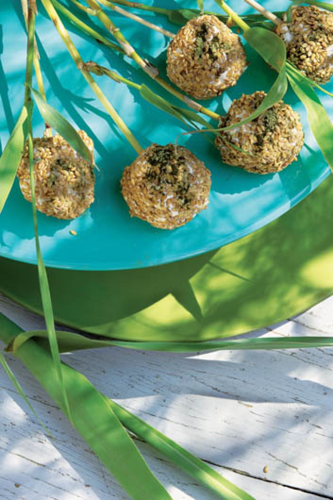 Do miski wlej sos sojowy, zetrzyj imbir, dodaj olej sezamowy, dokładnie wymieszaj. Połowę płynu odlej. Do reszty wrzuć tuńczyka pokrojonego w dwucentymetrową kostkę. Marynuj przez godzinę. Mak, sezam i sól starannie wymieszaj, praż na suchej patelni przez minutę, by uwolnić aromat. Kawałki tuńczyka obtaczaj w mieszance nasion, nadziewaj po jednym na szpadkę. Usmaż na patelni albo piecz na grillu minutę-dwie z każdej strony, w zależności od tego, jak bardzo mięso ma być wypieczone. Podawaj z odłożoną połową marynaty.