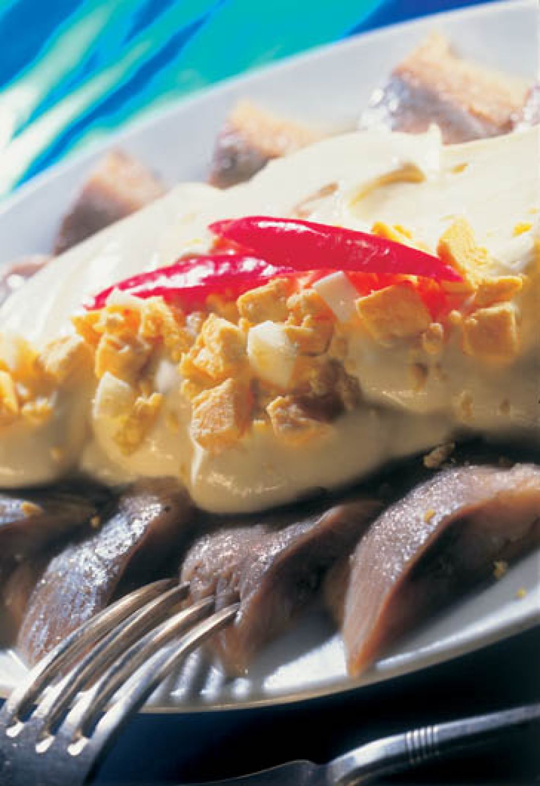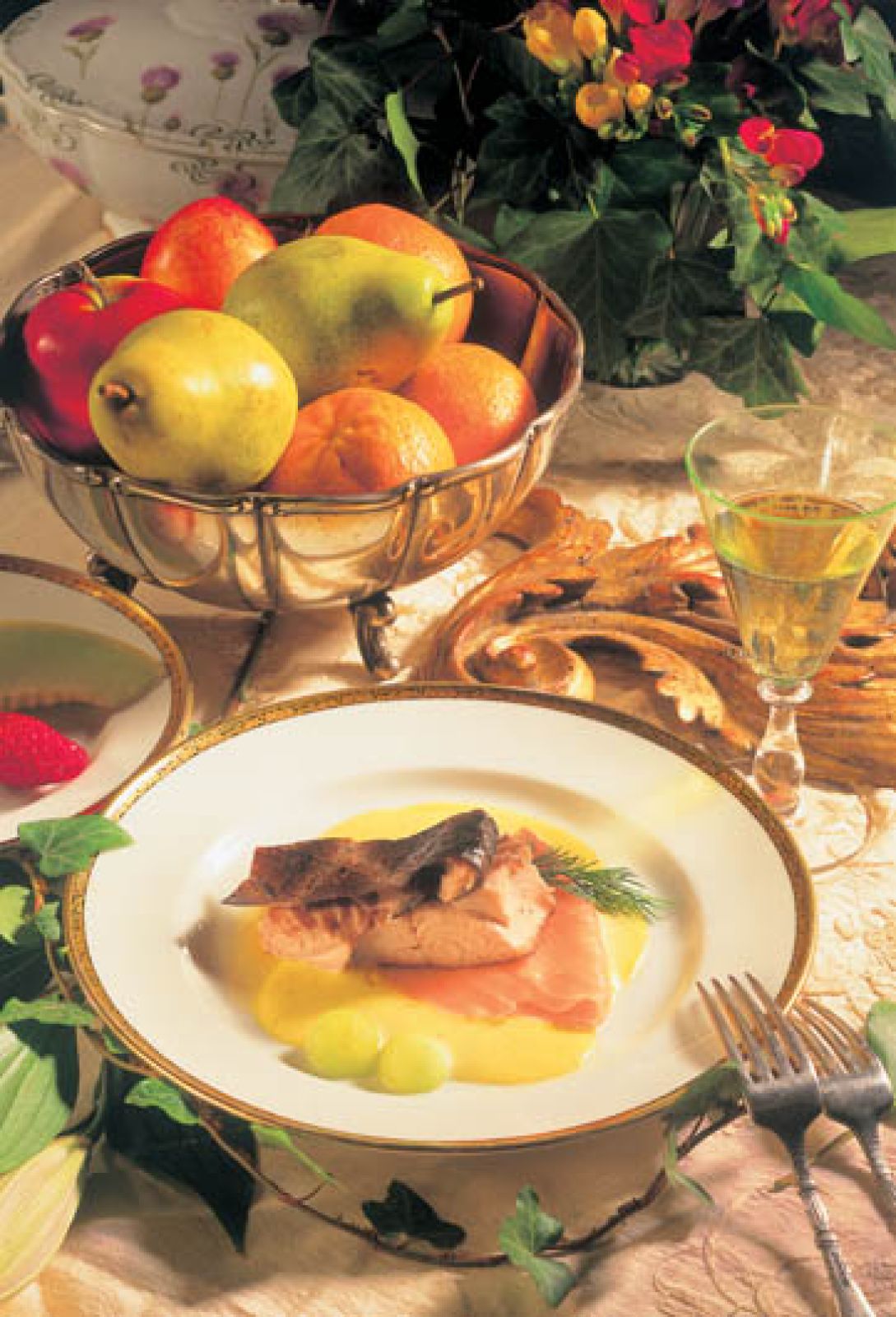 Rybę skrop cytryną, posól i popieprz, ułóż w koszyczku do gotowania na parze i przykryj. Zagotuj wodę z ziołami, postaw na wierzchu rybę. Gotuj siedem minut. Przygotuj sos: wymieszaj żółtka, sok z cytryny, sól, pieprz i łyżkę zimnej wody. Postaw naczynie na garnku z wrzątkiemi, ubijaj, aż sos zgęstnieje. Wtedy, mieszając, dodaj masło i ubitą śmietanę. Polej rybę tuż przed podaniem.