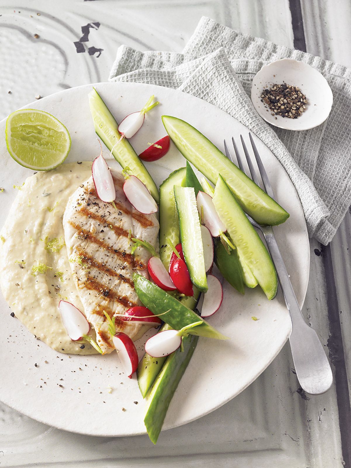 Fasolę osącz i zmiksuj z serkiem, startym imbirem, łyżką soku z limonki, curry, tymiankiem i musztardą. Dopraw solą i skórką startą z limonki (pół łyżeczki). Spróbuj i w razie potrzeby dodaj curry albo soku. Filet z kurczaka lekko rozbij, dopraw solą i pieprzem. Nasmaruj patelnię oliwą i smaż mięso po 3 minuty z każdej strony. Ogórek pokrój jak frytki, rzodkiewki podziel na ćwiartki. Na talerz wyłóż 2 łyżki pasty z fasoli, filet i ogórki. Posyp odrobiną startej skórki limonki, połóż ćwiartkę cytrusa.