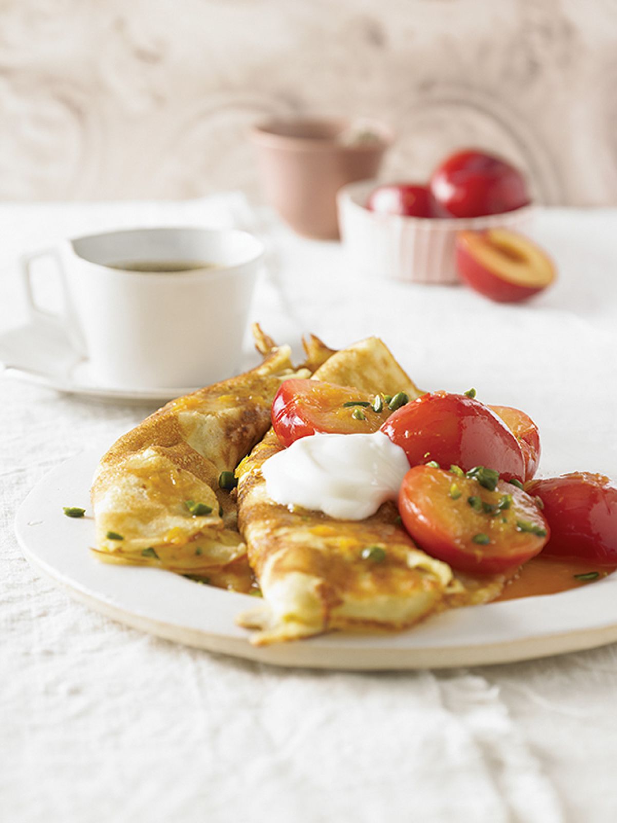 Ubij razem twarożek, wodę, sól, łyżeczkę cukru i jajo. Dodaj mąkę i cynamon, odstaw na kwadrans. W garnuszku zagotuj sok pomarańczowy z resztą cukru i kardamonem. Wrzuć połówki śliwek i gotuj pod przykryciem 5 minut. Zagrzej patelnię, natrzyj olejem i usmaż naleśniki. Wyłóż na talerz, udekoruj śliwkami, serkiem i posiekanymi pistacjami.