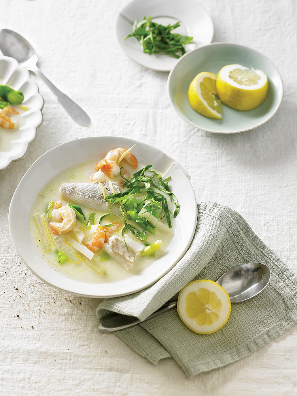Kalarepę pokrój w paski, por na małe kawałki, a imbir w plasterki. Nać posiekaj. Podzieloną na cząstki rybę polej łyżką soku z cytryny i odstaw. W garnku zagotuj bulion z mlekiem kokosowym, imbirem, olejem sezamowym, sosem rybnym i kawałkiem skórki z cytryny. Dorzuć kalarepę i por, gotuj 10 minut na małym ogniu. Na koniec wrzuć listki. Dodaj rybę z sokiem i zostaw 3 minuty na małym ogniu. Dorzuć krewetki i trzymaj w cieple 2 minuty. Dopraw solą, pieprzem i sokiem z cytryny.