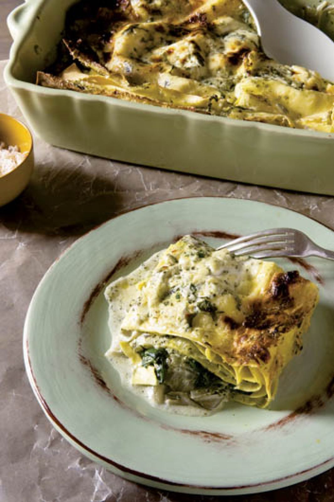 Zagotuj bulion, wrzuć do niego szpinak, blanszuj 5 minut, odcedź i odciśnij dokładnie. Odłóż, dopraw solą i pieprzem, dodaj posiekaną natkę pietruszki. Cukinię zetrzyj na tarce o grubych oczkach, przesmaż na łyżce oliwy na patelni, dopraw i odstaw. Na suchej patelni upraż orzeszki pinii, wrzuć do miksera razem z rukolą, czosnkiem i oliwą. Zmiksuj pesto. W osobnej misce wymieszaj utarty parmezan ze śmietanką, dodaj 3 łyżki bulionu. Na dno żaroodpornego naczynia nalej odrobinę bulionu, połóż warstwę ciasta. Przykryj cienką warstwą szpinaku, na nim połóż odrobinę pesto i polej kilkoma łyżkami śmietanki z parmezanem. Przełóż ciastem i układaj kolejną warstwę z cukinią, ponownie dodając pesto i podlewając sosem. Na górze musi być warstwa ciasta. Polej ją resztką sosu. Jeśli masz wrażenie, że potrawa jest zbyt sucha, dolej do naczynia trochę bulionu. Piecz 30 minut w temperaturze 200ºC.