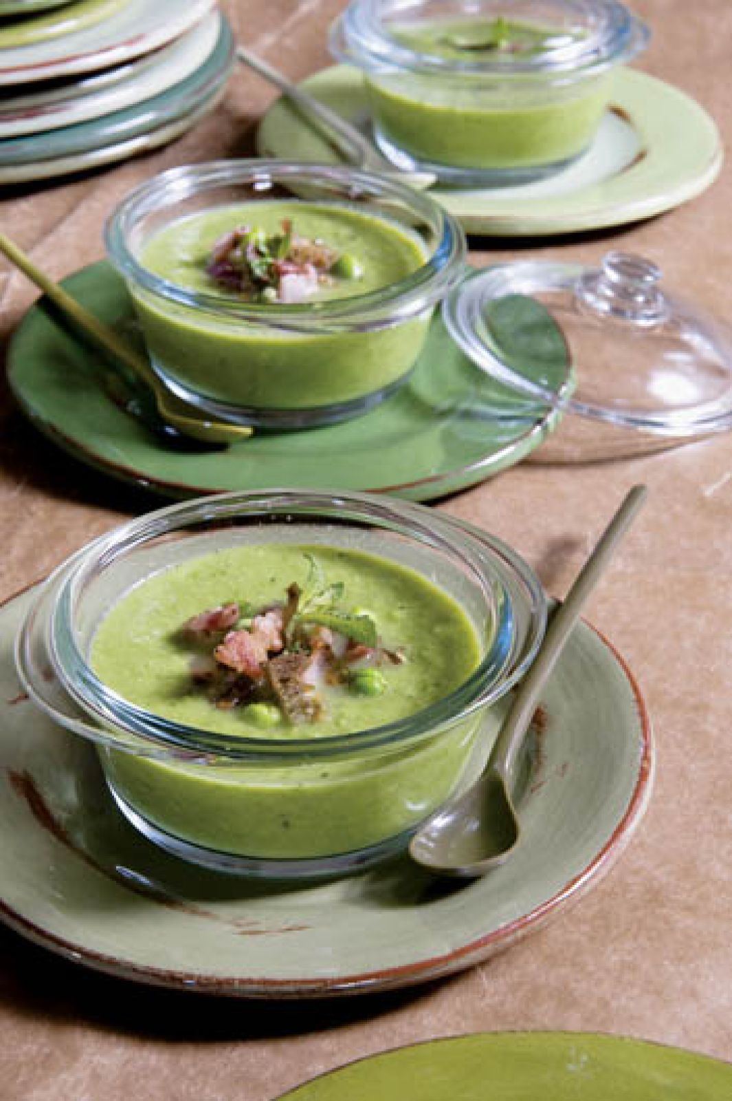 W garnku rozgrzej oliwę, wrzuć wyłuskany groszek, przesmaż 3 minuty, mieszając. Odsyp szklankę, resztę zostaw w garnku i dolej bulion. Wrzuć miętę, gotuj 5 minut. Dolej śmietankę, zamieszaj i zmiksuj wszystko na gładko. Wlej do garnka, dodaj odłożony groszek, trzymaj na małym ogniu. Boczek pokrój w kostkę, usmaż skwarki, zdejmij z patelni. Na pozostałym tłuszczu zrób grzanki z chleba. Rozlej zupę do miseczek, posyp grzankami i skwarkami. Smakuje również jako chłodnik.