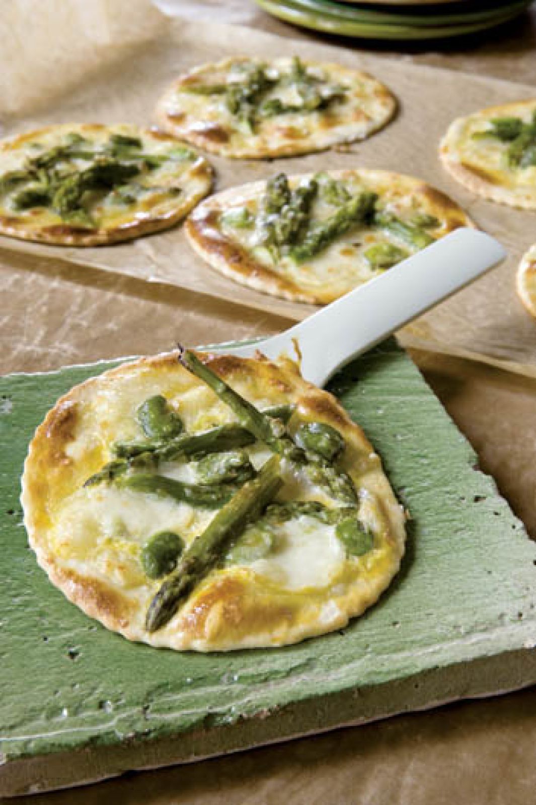 Ciasto rozłóż na blasze wyłożonej pergaminem do pieczenia, pokrój na kwadraty lub wytnij okręgi. Szparagi oczyść, usuń zdrewniałe końcówki. Bulion zagotuj, wrzuć szparagi, gotuj 5 minut, wyłów i odstaw. Do tego samego bulionu wrzuć bób, gotuj 10 minut. Ostudź i wyłuskaj. Mozzarellę pokrój w plastry. Jajo rozbełtaj, posmaruj ciasto. Na każdą porcję połóż 2–3 plastry mozzarelli, po kilka szparagów i trochę bobu oraz kilka listków bazylii. Dopraw solą i pieprzem, skrop lekko oliwą. Piecz 10–15 minut w temperaturze 200ºC.