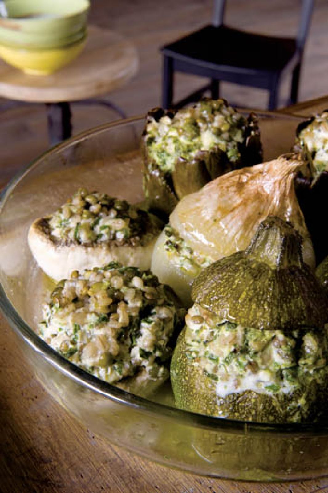 Zagotuj bulion. Z cukinii odetnij czubki, wrzuć wraz z resztą do bulionu i gotuj 5 minut. Wyłów, ostudź, ostrożnie usuń miąższ. Jeśli używasz pomidorów lub papryki, pomiń ten krok. Cebulę i pieczarki drobno posiekaj, wrzuć na patelnię z łyżką oliwy, przesmaż, aż zmiękną, dopraw. Do gotującego się bulionu wrzuć pęczak, po 10 minutach soczewicę, po kolejnych 10 – ryż. W sumie wszystko powinno się gotować mniej więcej pół godziny. Odcedź, przełóż do miski, dodaj cebulę z pieczarkami, posiekane zioła i ricottę oraz trochę posiekanego miąższu cukinii. Wbij jajko, wymieszaj dokładnie i dopraw. Nałóż do wydrążonych cukinii, przykryj czapeczkami i skrop oliwą. Piecz w temperaturze 180ºC przez 20 minut.