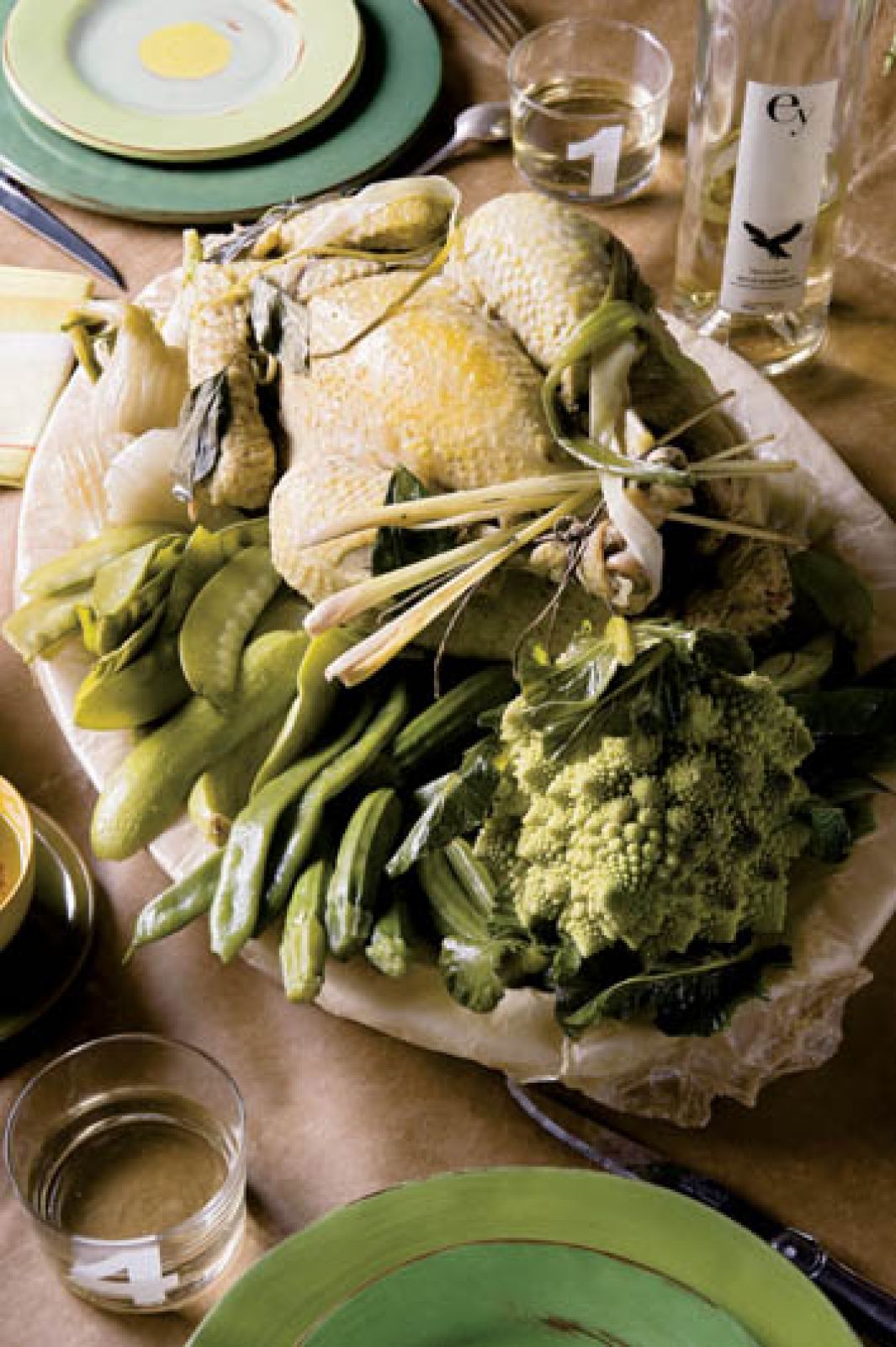 Kurczaka umyj, osusz, natrzyj masłem, solą i pieprzem, odstaw. Włóż do niego trawę cytrynową, bazylię, imbir i dymki pokrojone na kawałki. Otwór zepnij wykałaczkami. Wstaw w brytfance do piekarnika rozgrzanego do 180ºC. Piecz godzinę i 15 minut. Sprawdź, czy mięso jest dobre – nakłuj udko w najgrubszym miejscu. Jeśli wypłynie klarowny sok, jest gotowe do jedzenia. Brokuły podziel na różyczki, koper pokrój w plastry. Razem z groszkiem blanszuj warzywa we wrzątku przez 7 minut, wyłów. Kiedy mięso będzie dobre, dorzuć warzywa do brytfanki i piecz jeszcze 10–15 minut. Przygotuj sos. Białą część trawy cytrynowej obierz z twardej wierzchniej warstwy, drobniutko posiekaj. Wrzuć do miksera, dodaj pietruszkę, bazylię, sos sojowy i oliwę. Zmiksuj na gładko. Osobno posiekaj kapary i jajko na twardo, wymieszaj z sosem. Polej gotowego kurczaka i warzywa.