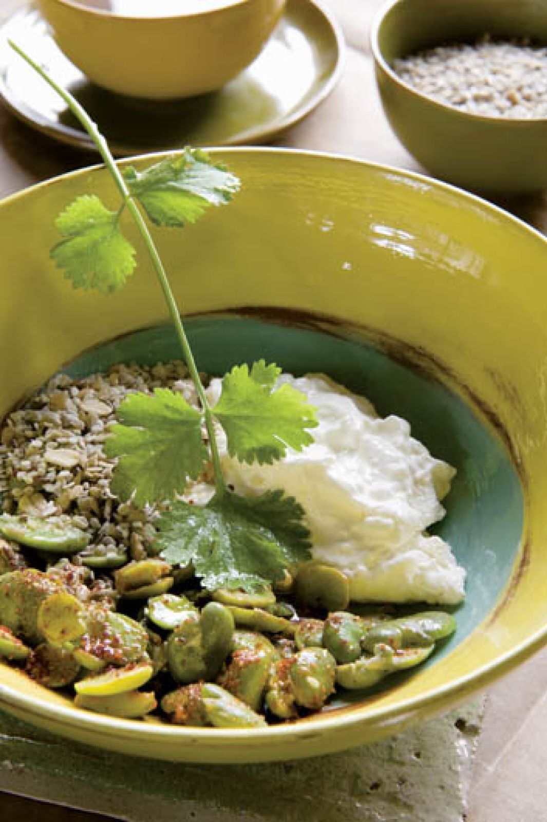 Bób ugotuj w osolonym wrzątku, opłucz w zimnej wodzie, wyłuskaj. W misce wymieszaj harissę, oliwę, sok z cytryny i posiekaną nać kolendry. Dodaj bób i odstaw na kilka minut. Na patelni rozgrzej odrobinę oliwy, wrzuć pokrojoną w kostkę cebulę i smaż minutę. Dodaj nasiona i orzechy, smaż, mieszając jeszcze 2 minuty. Na talerzach rozłóż bób, obok nasiona i nałóż po dużej łyżce jogurtu. Posyp odrobiną soli i pieprzu.