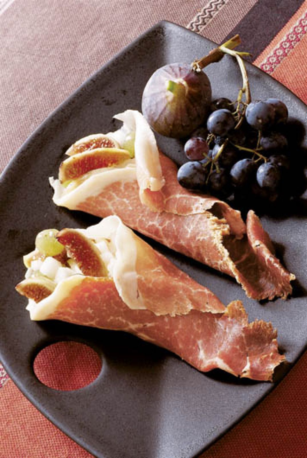 Jabłko i gruszkę obierz, pokrój w kostkę, skrop sokiem z cytryny, żeby nie sczerniały. Winogrona przekrój na pół, figi w kostkę. Wymieszaj owoce razem. Nakładaj porcję na plastry szynki i zawijaj w rulonik. Idealne jako przystawka.