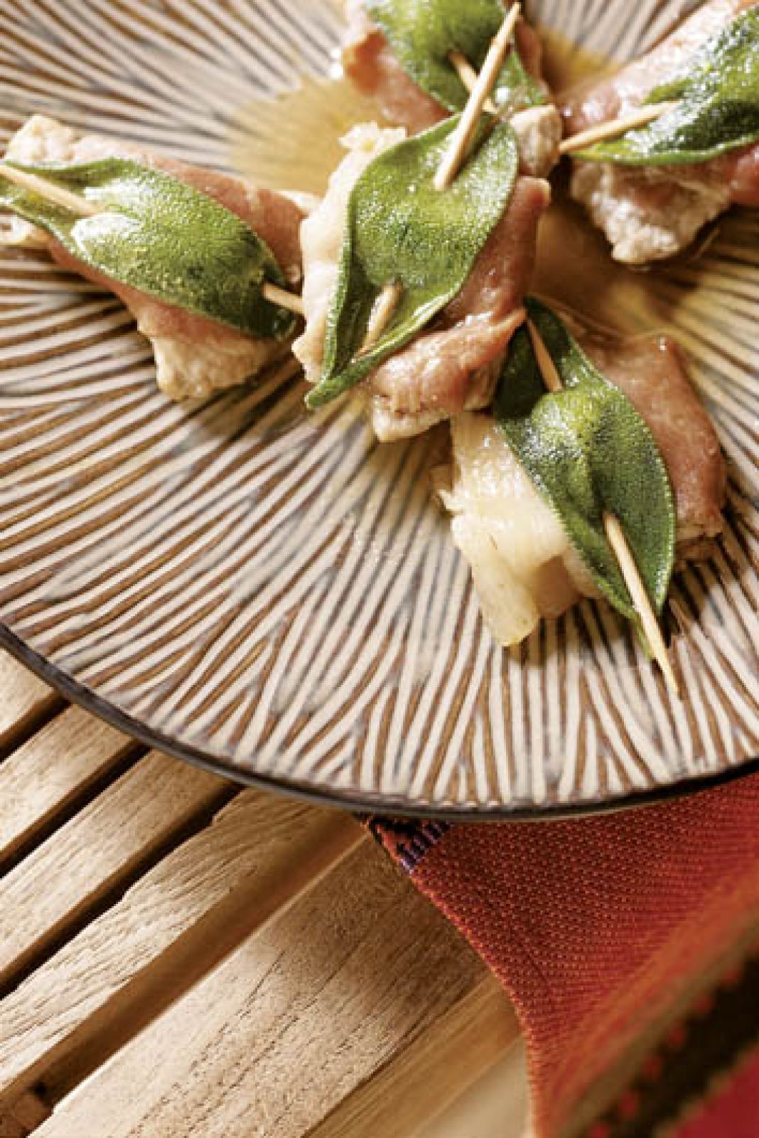 Mięso delikatnie rozbij, każdy kawałek podziel na 3 części i dopraw. Na 3 podziel również plastry szynki. Na każdym kawałku cielęciny połóż porcję szynki oraz listek szałwii, zepnij szpadką. Rozgrzej oliwę na patelni i smaż mięso po 5 minut z każdej strony. Odłóż i trzymaj w cieple. Na tę samą patelnię wlej wino, odparuj, wlej bulion i znów odparuj do połowy objętości. Dodaj posiekane kapary, dopraw i włóż mięso. Gotuj 2 minuty i podawaj z ziemniakami.