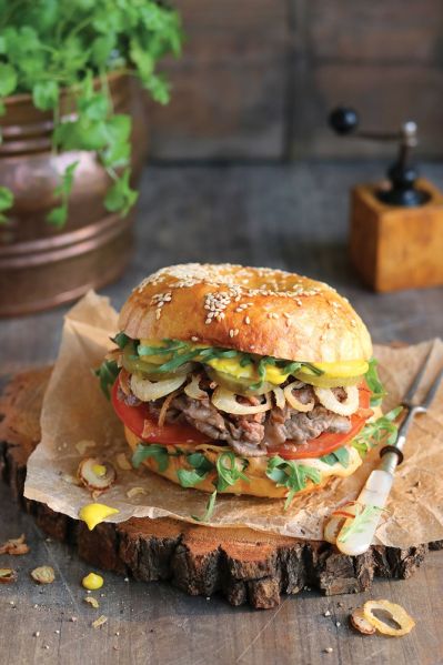 Potem wyjmij bajgle, posmaruj miodem i posyp sezamem. Piecz w 190°C na złoto (ok. 17 minut). Wołowinę pokrój na cienkie plastry. Rozgrzej mocno suchą patelnię, dodaj kroplę oliwy, wrzuć mięso i smaż ok. 20 sekund. Dodaj masło, świeży tymianek, sól i pieprz. Podawaj z zieleniną.