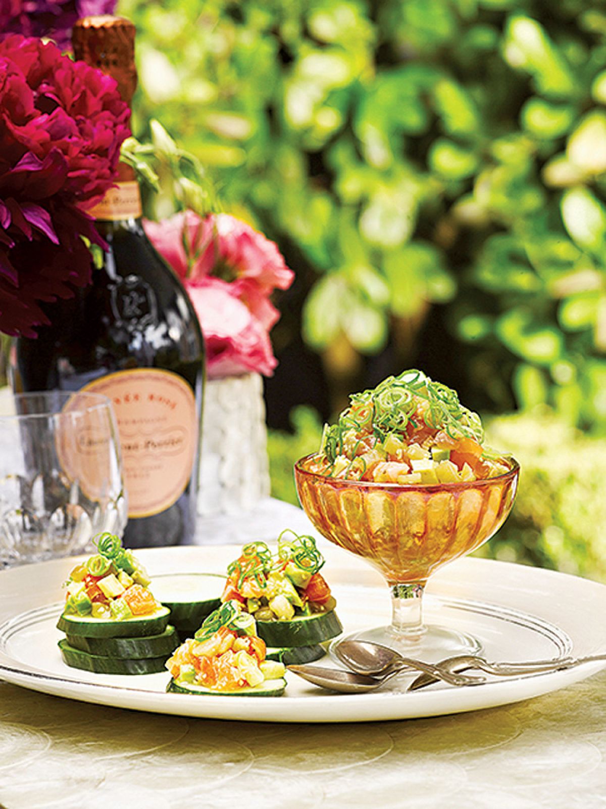 Bakłażana pokrój w niedużą kostkę i gotuj na parze przez kwadrans, aż będzie miękki. Wrzuć do miski, wymieszaj z oliwą i ostudź. Ogórka potnij na plastry grubości pół centymetra. Łososia i awokado pokrój w drobną kostkę, dorzuć do bakłażana, dodaj imbir i sos sojowy. Dokładnie wymieszaj i rozłóż mieszankę na plasterkach ogórka. Posyp posiekaną szalotką.