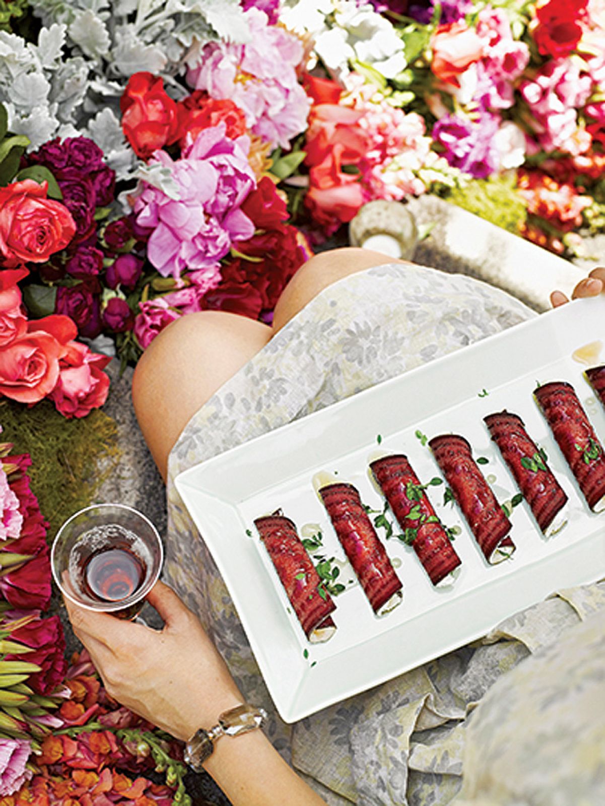 Buraka dobrze umyj i pokrój obieraczką do warzyw na cienkie plastry. Każdy posmaruj kozim serem, posyp ziołami i dopraw. Zwiń w rulonik, skrop miodem i posyp macierzanką. Schłódź 20 minut.