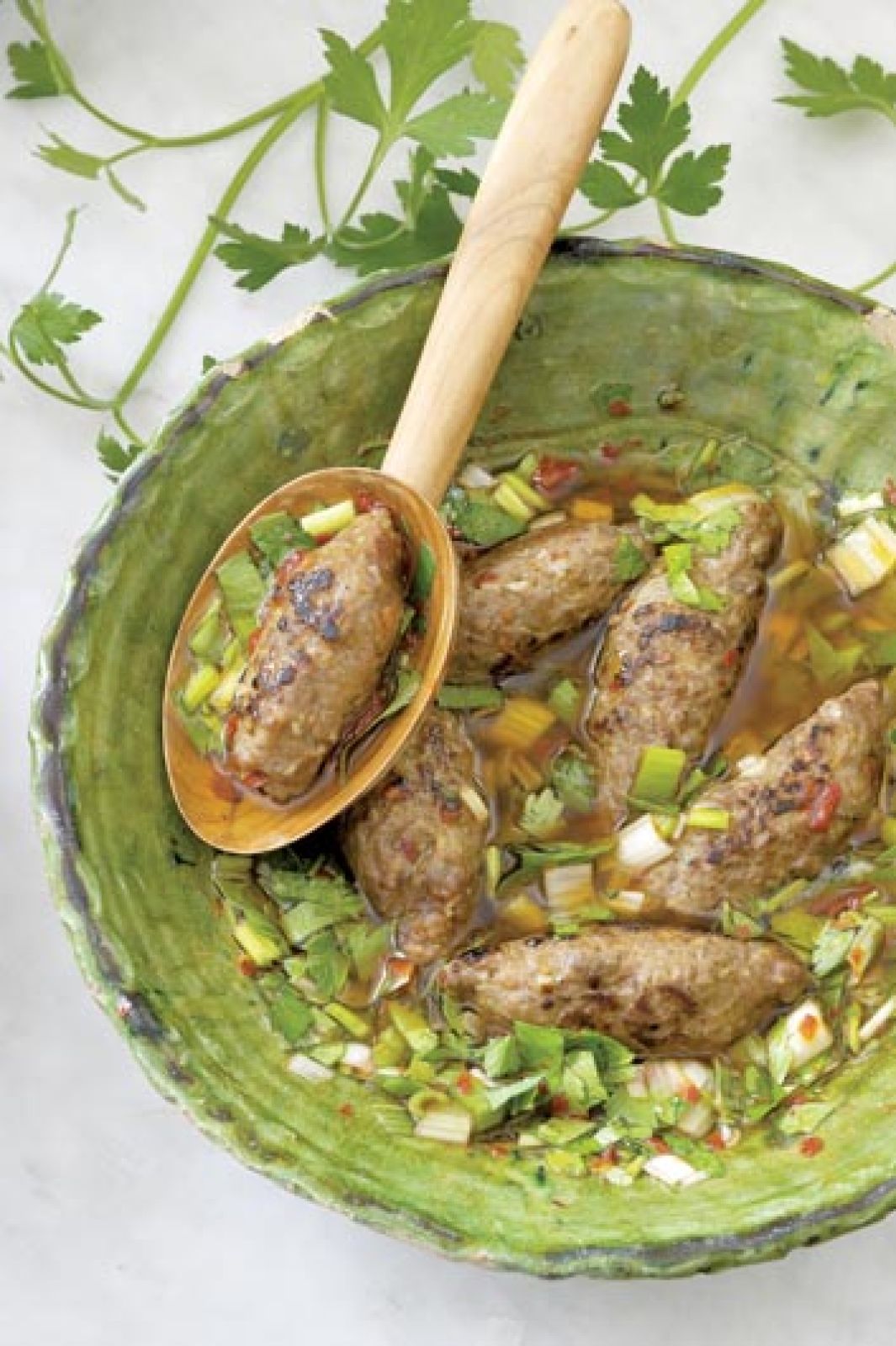 Nasiona kopru utłucz w moździerzu na proszek, czosnek przeciśnij przez praskę. Wrzuć do miski razem z mięsem, dodaj harissę, oliwę, przypraw i wymieszaj. Uformuj podłużne wałeczki i smaż na patelni grillowej lub normalnej, po 3 minuty z każdej strony. Podlej pół szklanki wody i duś kilka minut pod przykryciem. Zrób sos: dymki i natkę pietruszki drobno posiekaj, wymieszaj z oliwą, sokiem z cytryny i harissą. Zalej klopsiki, gotuj jeszcze dwie minuty i podawaj.