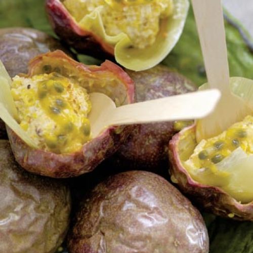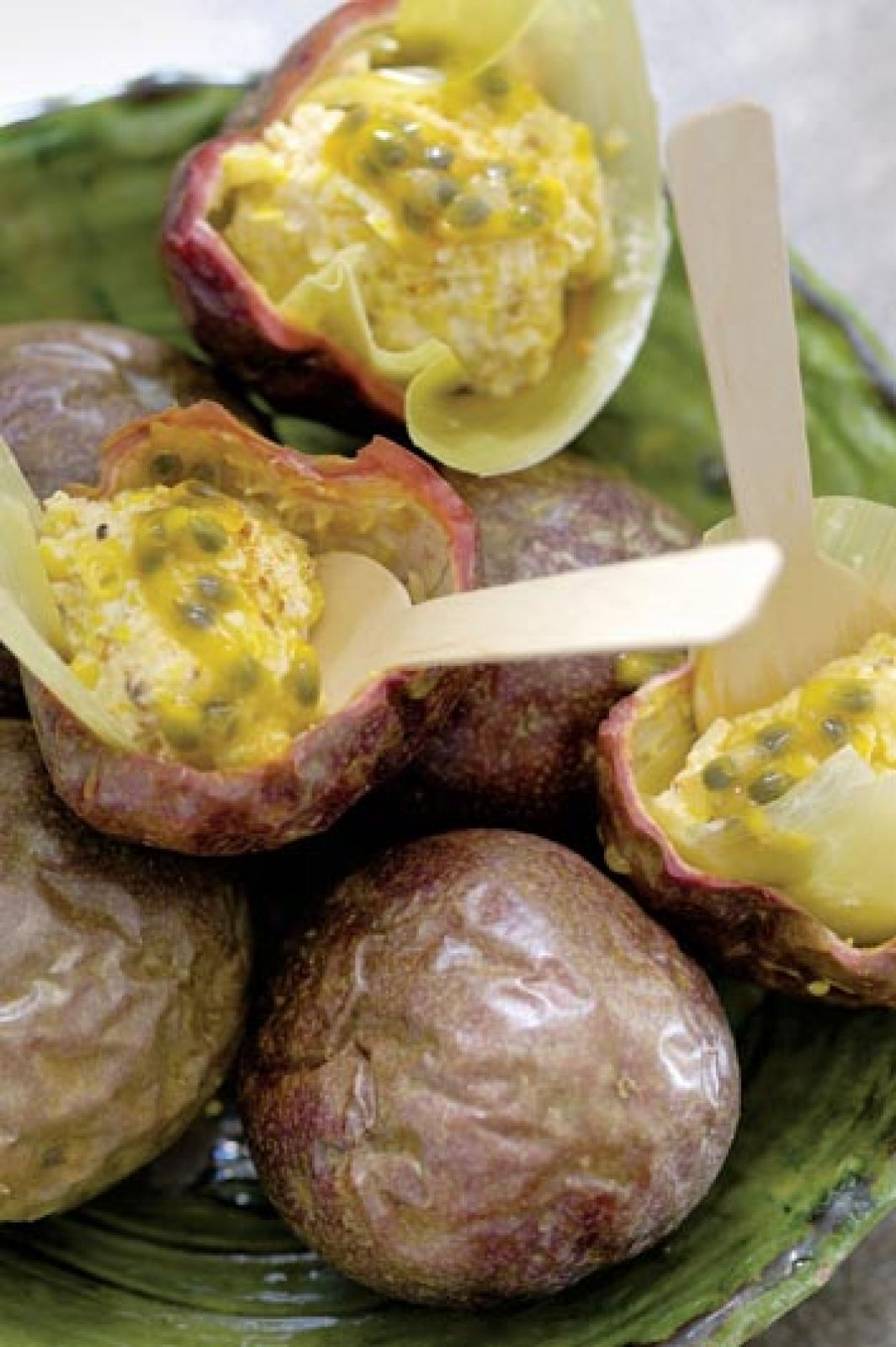 Kukurydzę osącz, wrzuć do miksera razem z mascarpone, zmiksuj. Wymieszaj w misce z osączonym z zalewy mięsem kraba, dopraw i schłódż. Marakuje przekrój na pół, usuń łyżką ziarenka z miąższem. Do każdej połówki włóż kuleczkę uformowaną z krabowo-kukurydzianego farszu, na wierzch połóż łyżkę ziarenek marakui. Podawaj schłodzone.