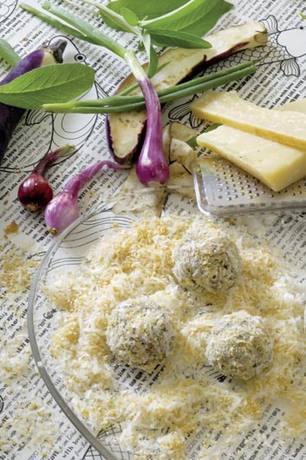 Cebulki posiekaj, wymieszaj w misce z rozgniecionym i doprawionym twarożkiem. Uformuj małe kulki i włóż do lodówki na godzinę. Rzodkiewki zetrzyj na tarce, oliwki i zioła posiekaj. Kulki podziel na 3 części. Jedną obtocz w rzodkiewce, drugą w oliwkach, trzecią w ziołach. Podawaj schłodzone.