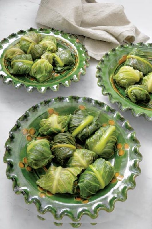 Cebulę i czosnek drobno posiekaj, zeszklij na łyżce oleju. Wymieszaj w misce z mięsem i drobno posiekanymi ziołami oraz anyżem. Ryż podgotuj 10 minut, osącz, dodaj do masy. Wbij jaja, dopraw i wyrób na gładko. Wybierz duże liście sałaty, blanszuj we wrzątku 3 minuty, wrzuć do zimnej wody, potem osusz. Nakładaj farsz na liście i zawijaj jak małe gołąbki. Zrób sos: pomidory sparz, obierz i posiekaj, wrzuć na rozgrzaną w garnku oliwę. Dodaj przeciśnięty przez praskę czosnek, dopraw, dolej odrobinę wody i gotuj 10 minut. Gołąbki ułóż w naczyniu do zapiekania, polej sosem, tak by były przykryte – jeśli sosu zabraknie, dodaj wody – przykryj i wstaw na pół godziny do piekarnika nagrzanego do 150ºC. Można podać z pilawem.
