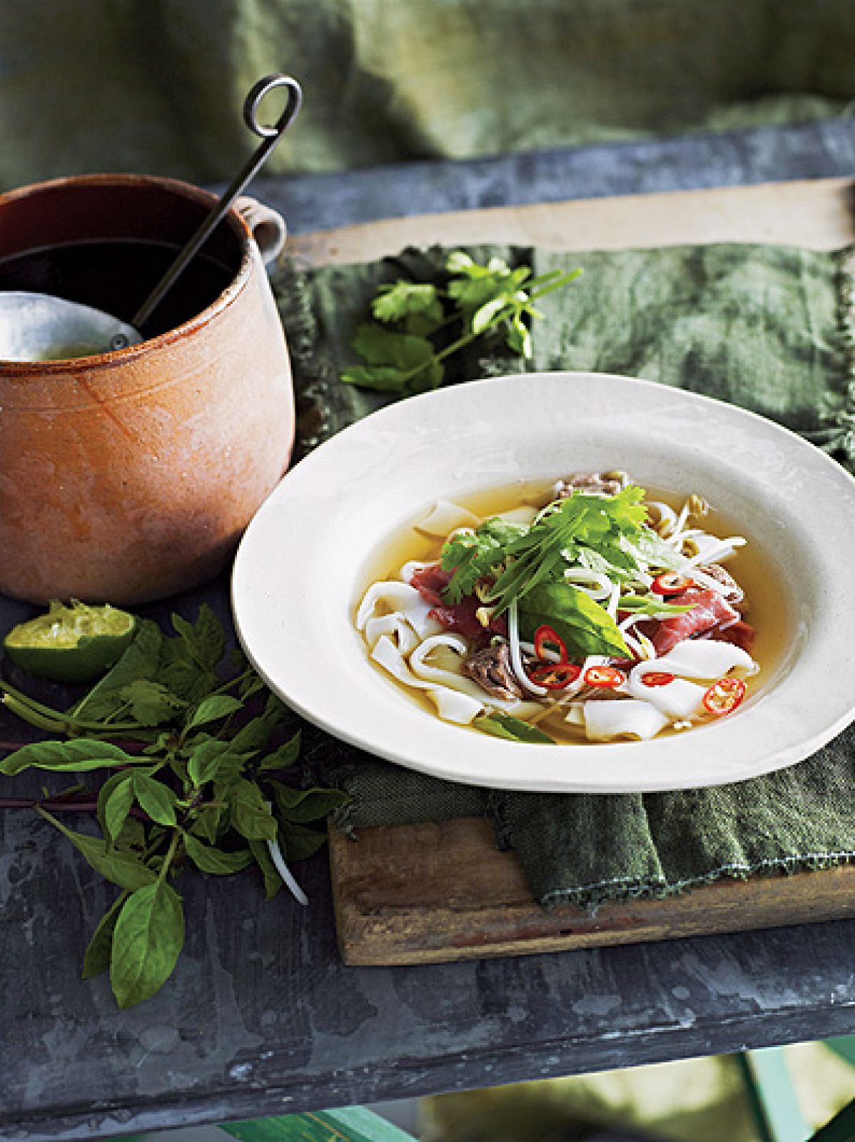 Włóż mięso do garnka, zalej zimną wodą i gotuj 5 minut, następnie wylej wodę, a mięso dokładnie przepłucz pod kranem. Włóż ponownie do garnka, zalej zimną wodą, doprowadź do wrzenia. Wszystkie przyprawy zawiń w kawałek muślinu lub gazę, zwiąż bawełnianą nitką i wrzuć do garnka. Cebule przekrój na pół, opal nad palnikiem kilka minut, dodaj do zupy razem z pokrojonym w plasterki imbirem. Gotuj 4 godziny na małym ogniu, od czasu do czasu szumując wywar. Dopraw zupę cukrem, sosem rybnym i solą. Ostudź, przecedź przez sitko wyłożone muślinem i wstaw bulion na noc do lodówki. Rano zdejmij z wierzchu tłuszcz i zagotuj zupę. Mięso podziel na kawałki, dodaj do zupy. Ugotuj makaron ryżowy (3-5 minut), aż będzie al dente. Odcedź i rozłóż do miseczek. Surowy rostbef pokrój w cieniutkie plasterki, dodaj do miseczek. Zalej wrzącym bulionem. Na osobnym talerzu podaj zieleninę, posiekane chili i dymkę oraz pokrojone w ćwiartki limonki – każdy doda sobie, co lubi.
