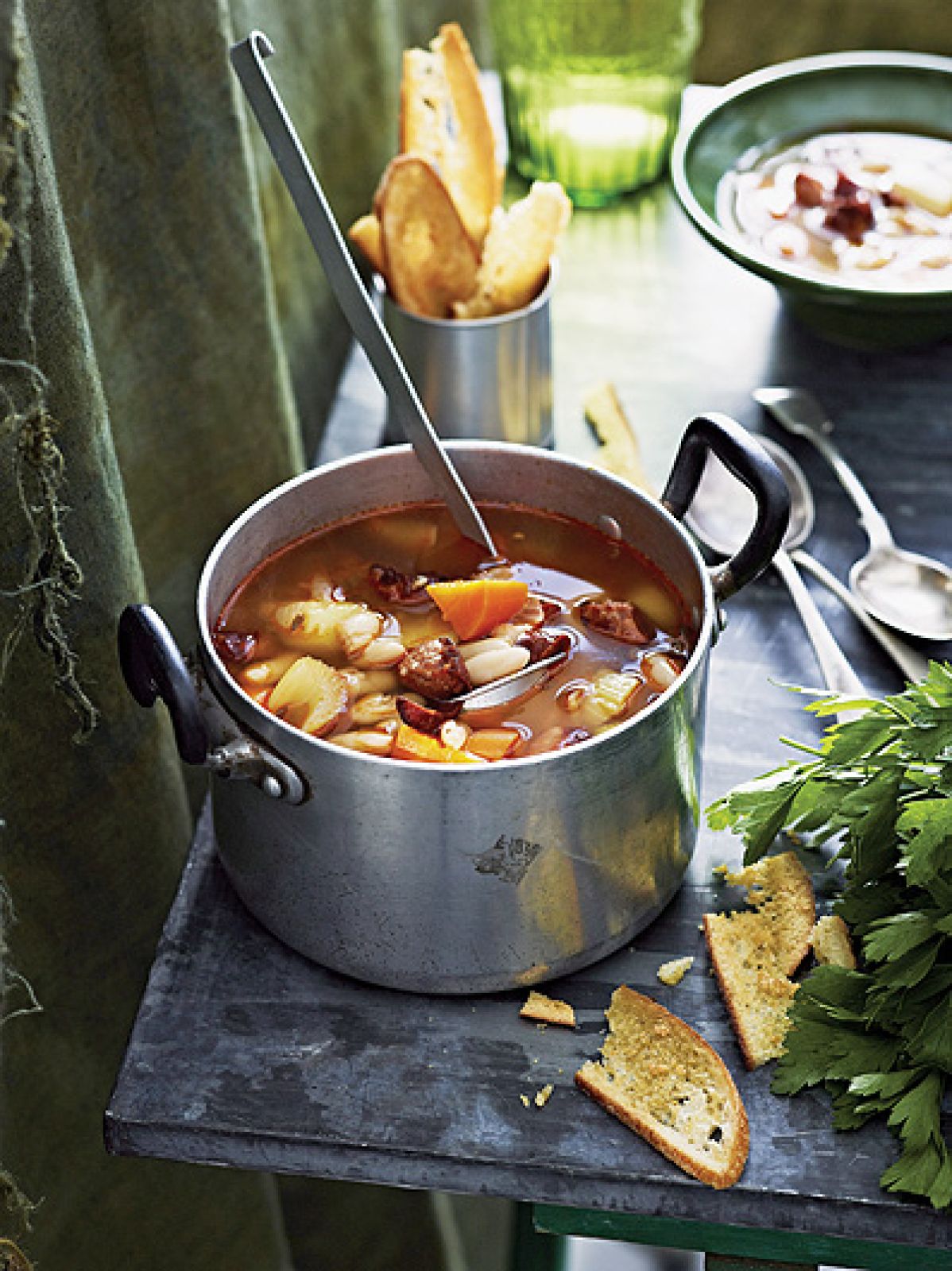 Chorizo, cebulę, seler, ziemniaki oraz marchew pokrój w grubą kostkę. Pomidory sparz, obierz, posiekaj. W garnku zagrzej oliwę, wrzuć chorizo i smaż 3 minuty. Wyłów, dodaj cebulę, seler, marchew i ziemniaki. Smaż 5 minut, mieszając. Wrzuć rozgniecione ząbki czosnku, tymianek i paprykę. Zamieszaj, smaż minutę. Dodaj pomidory i chorizo, wlej bulion. Zmniejsz płomień, gotuj kwadrans. Wrzuć odcedzoną fasolę, dopraw zupę i gotuj 5 minut. Zrób grzanki. Zagrzej piekarnik do 180ºC. Pokrój bagietkę w plastry, skrop oliwą, natrzyj przekrojonym ząbkiem czosnku. Posyp odrobiną gruboziarnistej soli. Piecz, aż się zrumieni. Podawaj zupę z grzankami i natką.