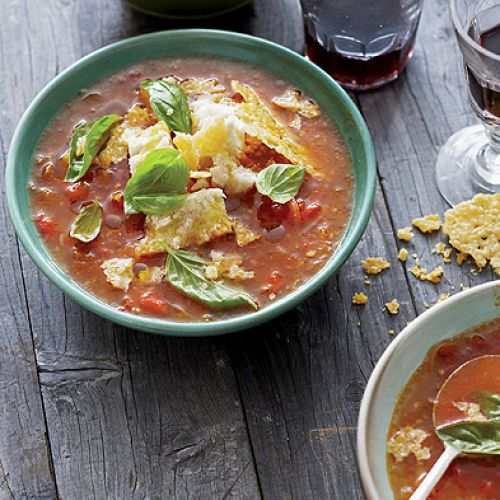 Pomidory natnij, sparz, obierz i posiekaj. Cebulę i seler posiekaj, ząbek czosnku przeciśnij przez praskę, jeden zostaw w całości. Chleb pokrój w kostkę. W garnku rozgrzej 3 łyżki oliwy, wrzuć cebulę, zeszklij, dodaj seler i cały ząbek czosnku. Dodaj pomidory, dopraw solą i pieprzem, gotuj 5 minut. Wlej bulion, dodaj chleb i gotuj jeszcze 20 minut pod przykryciem. Dopraw bazylią i przeciśniętym przez praskę czosnkiem, upewnij się, że podczas gotowania cały chleb się rozpadł, a zupa jest naprawdę gęsta. Podawaj na ciepło lub zimno, polaną oliwą, z grzankami z bułki.