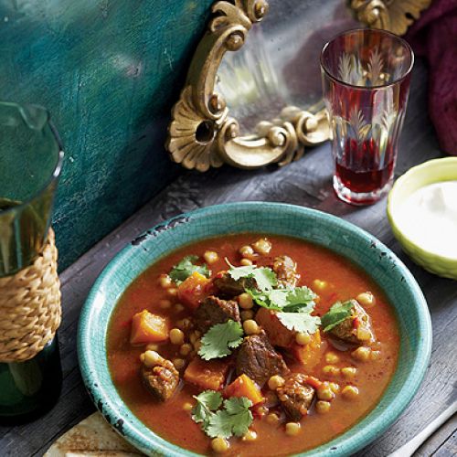 Cebulę posiekaj, dynię obierz, usuń nasiona i pokrój w kostkę. W dużym garnku rozgrzej oliwę, wrzuć cebulę, przyrumień. Mięso natrzyj przyprawą ras el hanout, obsmaż. Wlej bulion, wodę i sok pomidorowy. Gotuj na małym ogniu 2 godziny, aż mięso będzie miękkie i zacznie się oddzielać od kości. Dorzuć osączoną cieciorkę i dynię, gotuj jeszcze 25 minut, aż dynia zmięknie. Dopraw i posyp posiekaną kolendrą.
