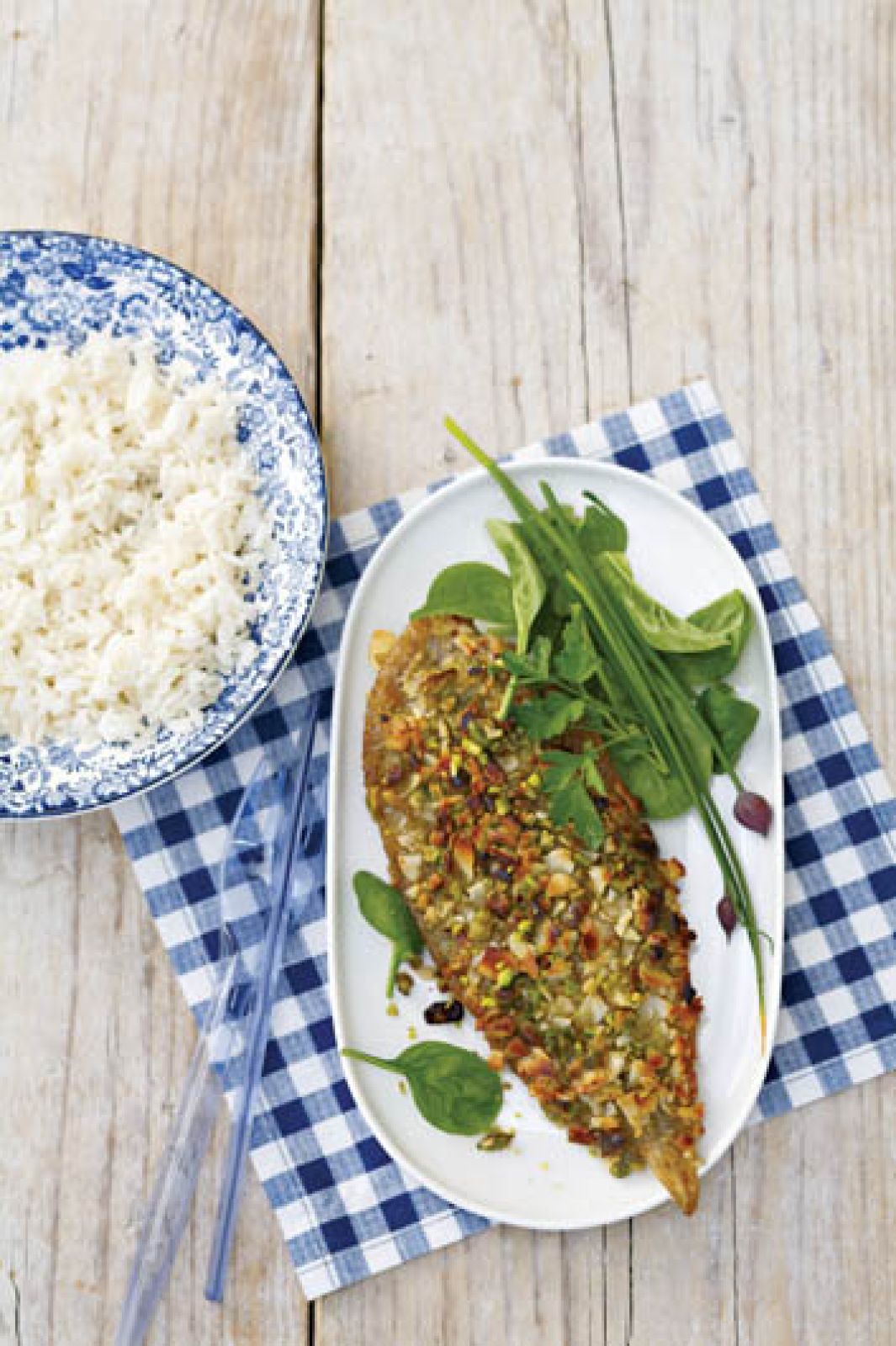Pistacje wyłuskaj i razem z migdałami utłucz dość grubo w moździerzu. Filety dopraw, jajo rozbełtaj w głębokim talerzu. Panieruj filety w mące, jaju i orzechach. Rozgrzej na patelni masło z oliwą. Smaż ryby przez około 2 minuty z każdej strony. Podawaj z ryżem, sosem tatarskim i zieloną sałatą.
