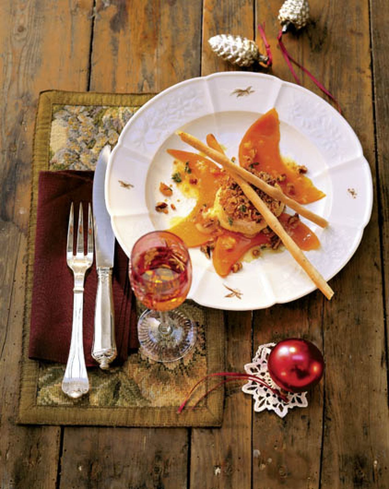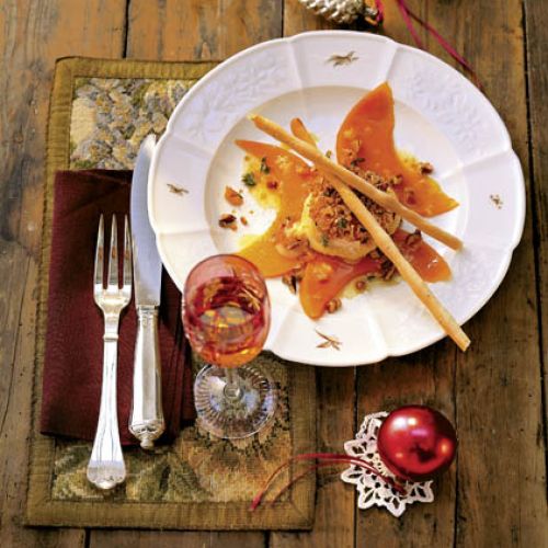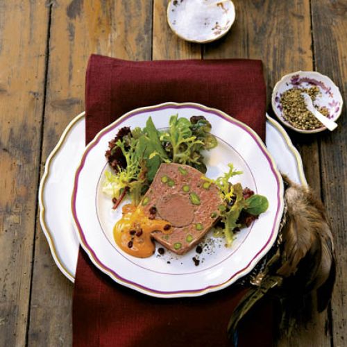 Zrób sos: obierz owoce, wyciśnij z nich sok. W garnuszku zagotuj połowę soku ze skórkami i cynamonem, gotuj 7 minut. Wyłów skórkę i cynamon, dodaj konfiturę z róży. Musztardę rozpuść w reszcie soku, dodaj do garnka. Wymieszaj i gotuj 3 minuty. Ostudź, następnie rozłóż na talerze plastry terrine, polej sosem. Podawaj z zieloną sałatą.