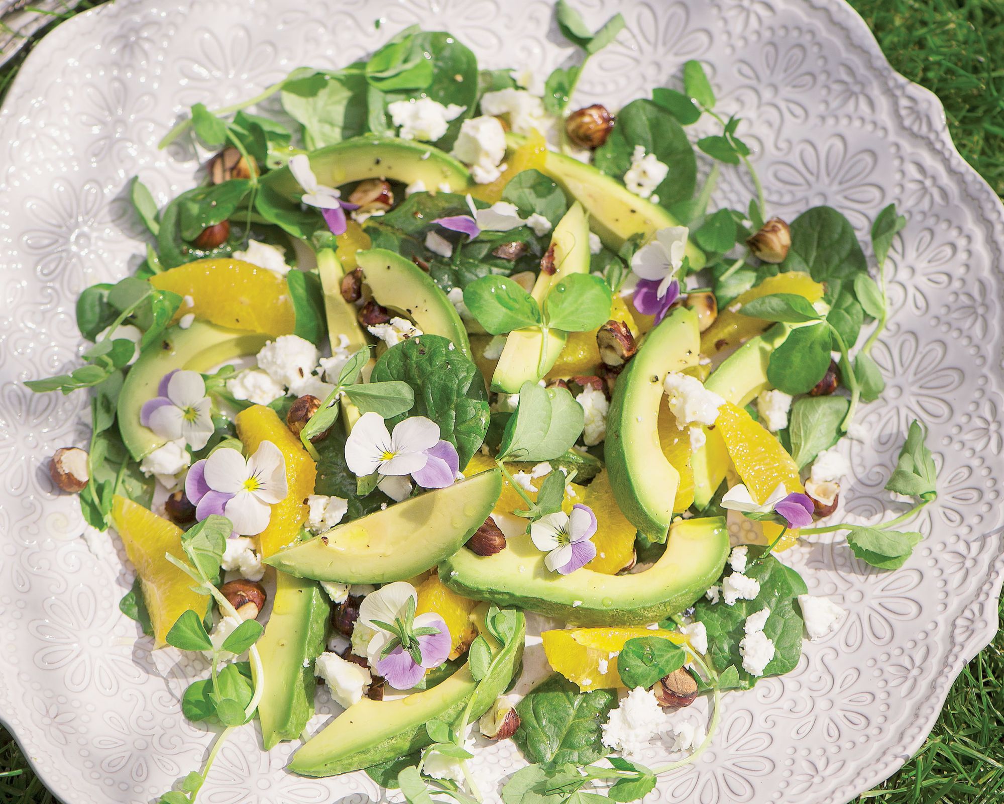 Lekka przekąska, kolorowa przystawka lub zdrowy obiad - sałatka ze szpinakiem! Składniki: •garść orzechów laskowych •duża pomarańcza •dojrzałe awokado •cytryna •garść kiełków zielonego groszku •duża garść listków młodego szpinaku •kawałek sera feta •garstka jadalnych kwiatów (fiołków trójbarwnych) dressing: •3 łyżki oliwy •łyżka czerwonego octu winnego •sól i pieprz &nb