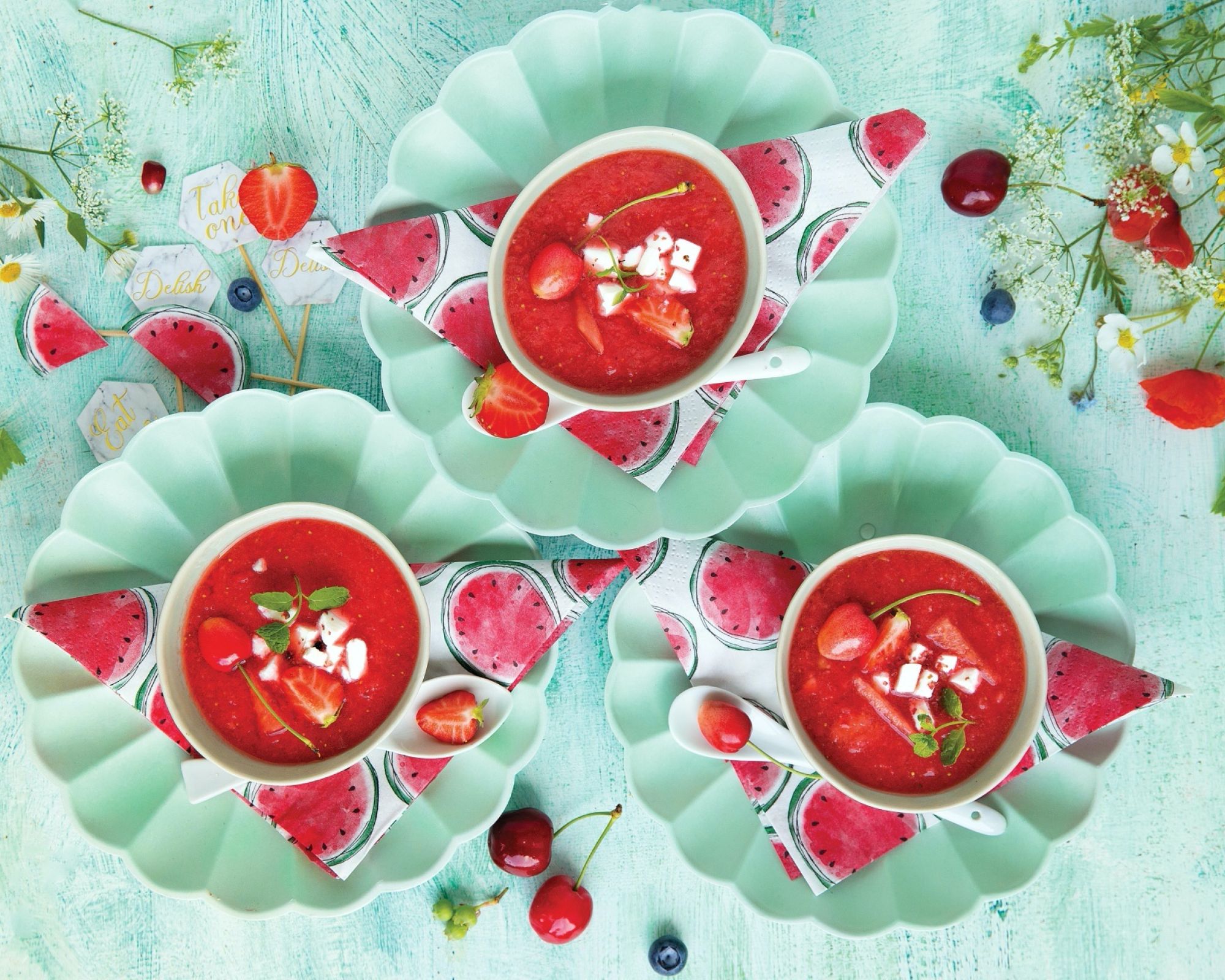Kompot z rabarbarem i malinami, orzeźwiająca salsa truskawkowa, gazpacho z pieczonych pomidorów i Red Velvet Cake – oto nasze sprawdzone przepisy na letnią ucztę w domu lub w ogrodzie.