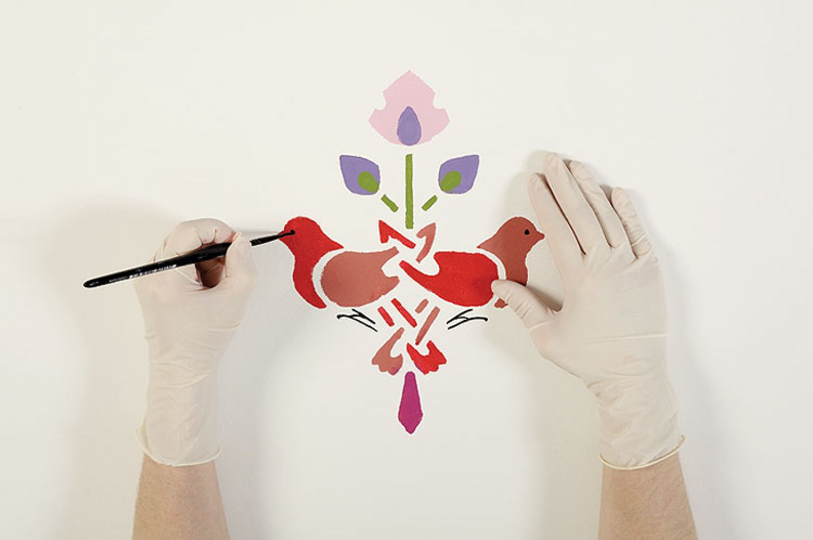 Ludowość może być traktowana dosłownie i wtedy w domu pojawi się zydelek, rzeźbiona ława, posagowa skrzynia albo malowana szafa znaleziona na starociach. My natomiast proponujemy zabawę wzorami. Stąd pomysł na ornament z gruchającymi gołębiami.