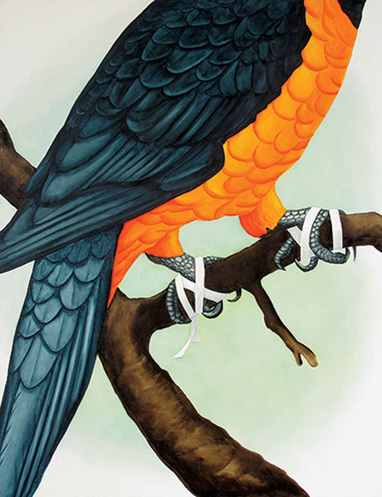 Dokładnie pamiętam to muzeum. I wystawę sprzed wielu lat: wielkie sale w starym klasztorze, od podłogi do sufitu niekończące się regały wypakowane eksponatami – dziesiątkami tysięcy przedstawicieli lokalnej fauny. Pięknymi, kolorowymi, starannie upozowanymi i bardzo, bardzo martwymi. Oglądałam je urzeczona, ale czułam się dziwnie. „Woodland” Dawida Czycza budzi we mnie podobne uczucia – fascynację pomieszaną z zachwytem, przyprawione solidną dawką niepokoju. Zwierzęta z jego obrazów bardziej przypominają fantastyczne eksponaty niż żywe organizmy. Wrona przykryta serwetą, srebrne rybsko nurkujące w niebyt, łapki bajecznie kolorowej papużki przywiązane do gałęzi… Wytrącone z naturalnego kontekstu i starannie upozowane czekają na swoją publiczność. Kiedy przyjdzie, będą ją czarować i kokietować – tu pokażą ponętną łapkę, tam krwistoczerwony kuperek. Barwna rycina przyrodnicza, peep-show i makabreska w jednym! Przyznaję bez bicia, że na mnie to działa.