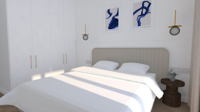 Bazę projektu stanowią naturalne materiały i jasne barwy, ale nie jest tu nudno. Całość została wzbogacona o wyszukane dodatki, takie jak abstrakcyjne wzory na dywanie i subtelne, złote elementy dekoracyjne. W sypialni ulokowano toaletkę z dostępem do naturalnego światła, zagłówki łóżka zostały ozdobione pięknymi przeszyciami, a na ścianach znalazła się oryginalna sztukateria.