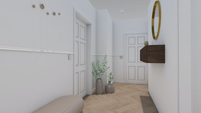 W hallu znajdziemy wydzieloną przestrzeń garderobianą, idealną do przechowywania dużej ilości rzeczy. Kuchnia z wyspą została połączona z salonem i jadalnią, tworząc przestrzeń do spotkań z przyjaciółmi i wspólnego przyrządzania posiłków. To prawdziwa oaza spokoju.