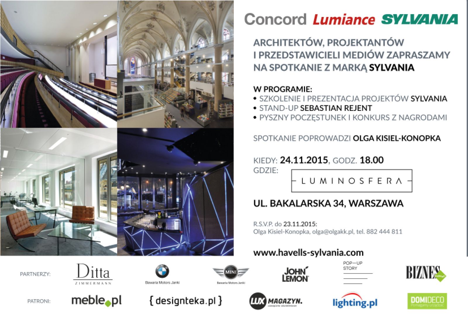 Architektów wnętrz publicznych, projektantów i przedstawicieli mediów zapraszamy na spotkanie z marką Sylvania, które odbędzie się 24 listopada 2015 o godzinie 18 w Luminosferze przy ulicy Bakalarskiej 34 w Warszawie.