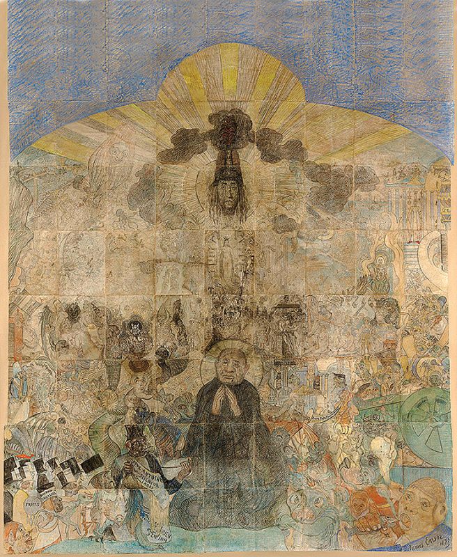 Na „Kuszenie św. Antoniego” Ensora składa się 51 kartek papieru naklejonych na płótno. 51 kartek wypełnionych kłębiącymi się pokusami, przypuszczającymi szturm na świętego. Otaczają go szczelnie, zabierając przestrzeń i powietrze, napierają bez litości, wciskają się w najmniejszą szczelinę. Święty może i da radę stawić opór, jednak zwykły człowiek nie ma żadnych szans. Tym bardziej że do „klasycznych” pokus dołączyły zastępy nowych, godnych końca XIX wieku. W modnych cylindrach, uzbrojone w nowoczesną technikę. Apokalipsa czai się za rogiem. Nikt nie potrafił tak jak Ensor jednocześnie kpić, przestrzegać, straszyć i zachwycać. Schowany w swojej pracowni w Ostendzie (mieście, które opuścił raptem kilka razy w życiu) niczym święty Antoni w jaskini, podglądał świat, zamiast w nim żyć, ale widział więcej niż ktokolwiek inny. Porzucił więc obowiązujący w ówczesnej sztuce naturalizm (koniec lat 80. XIX w.) na rzecz groteski, onirycznego symbolizmu i nieskrępowanej fantazji.