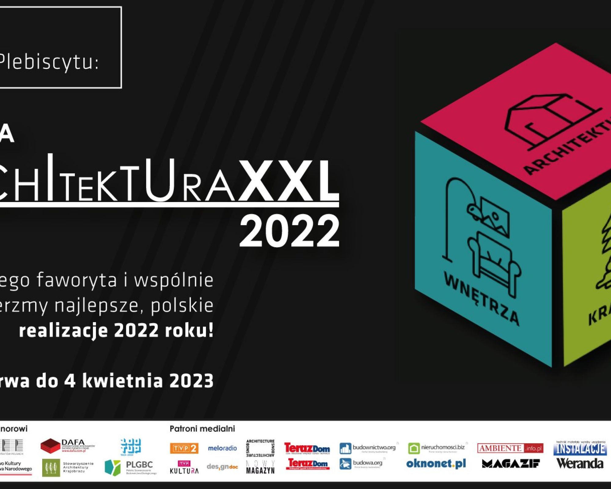 Zapraszamy do głosowania w Plebiscycie Polska Architektura XXL, którego celem jest wyróżnienie najbardziej kreatywnych pracowni i projektów 2022 roku zrealizowanych w Polsce. To jedyny plebiscyt, który obejmuje swoim zasięgiem wszystkie dziedziny projektowania: kubaturę, wnętrza i krajobraz. Tradycyjnie już laureaci wybrani zostaną dwutorowo. Głosuje publiczność i profesjonalne jury. Głosowanie internautów potrwa do 4 kwietnia 2023 r.