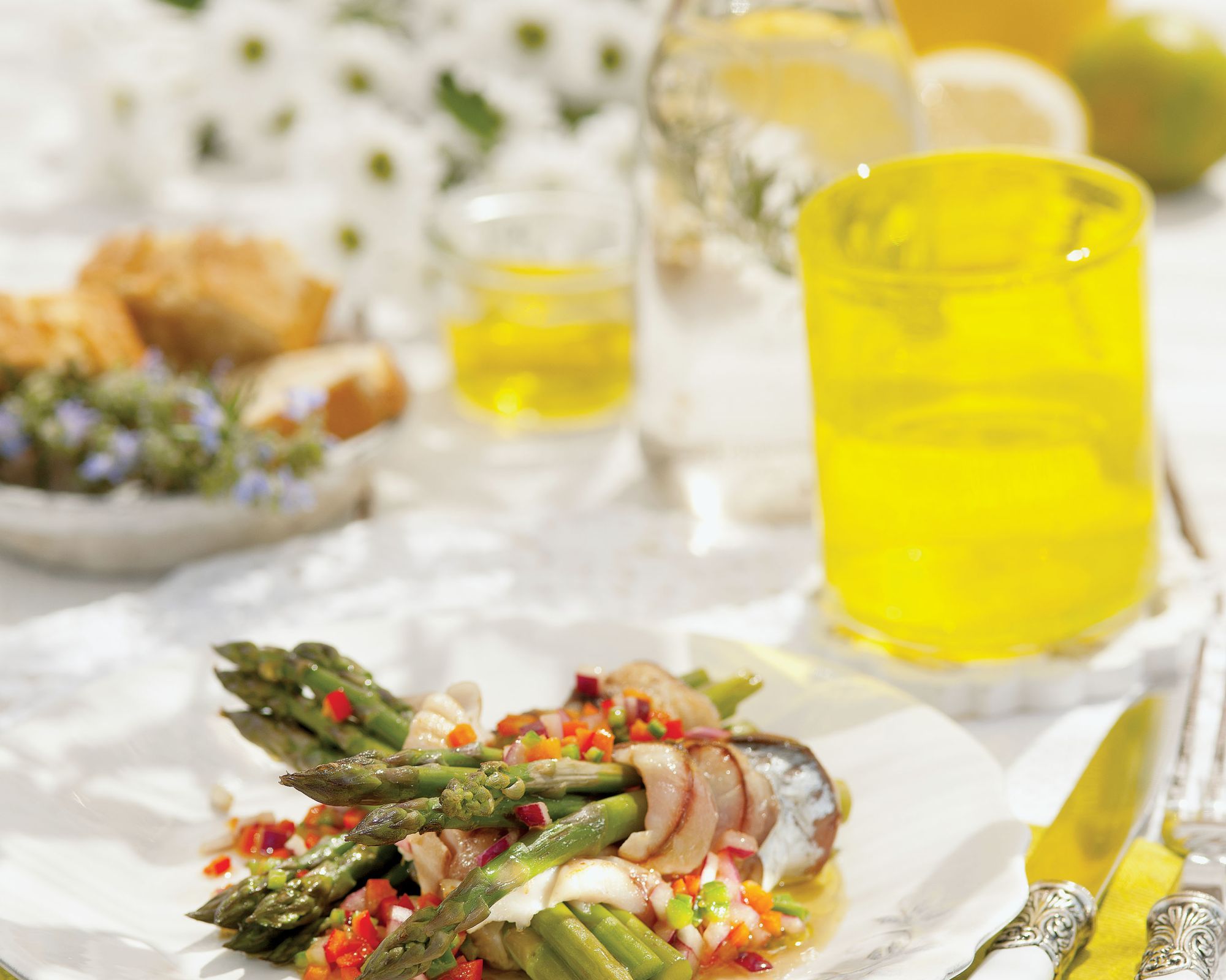 Szybkie danie idealne także na piknik! Składniki: •3 pęczki szparagów •8 filetów z makreli •małą czerwoną cebulę •2 zielone papryki •2 czerwone papryki •2 żółte papryki •ogórek •2 pomidory •6 łyżek oliwy extra virgin •łyżkę octu z białego wina •sól i pieprz Sposób przygotowania: Szparagi oczyść, przytnij końce, wrzuć do osolonego wrzątku na 5 minut. Przełóż d